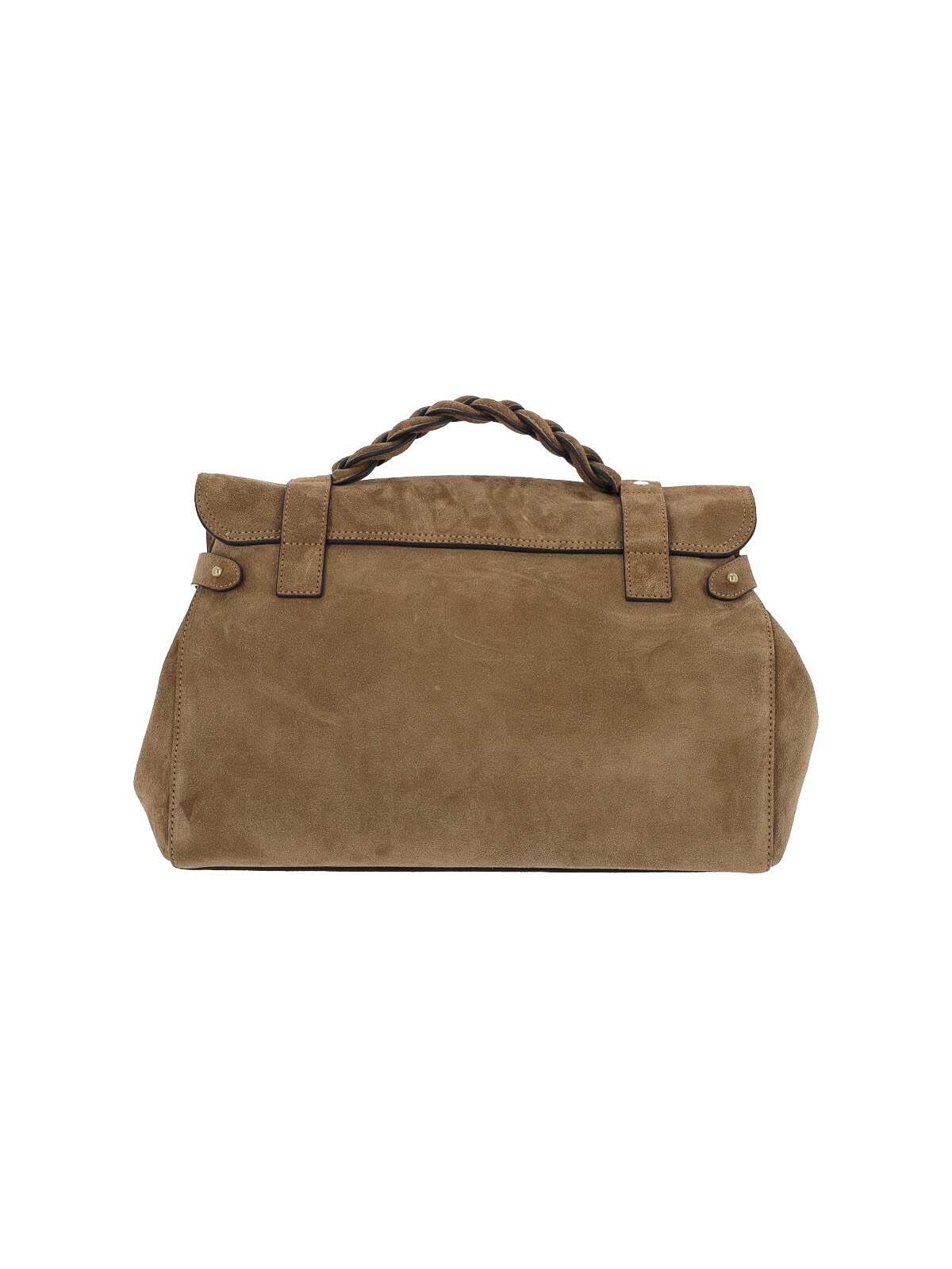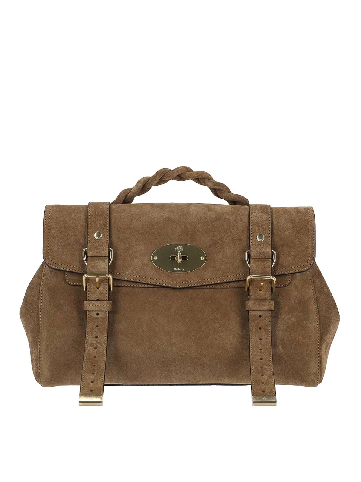 Mulberry alexa shoulder bag, in brown suede, braided top handle, adjustable and removable shoulder strap, postman's lock padlock closure, buckles and magnetic flap, one internal zip pocket, one main internal compartment.