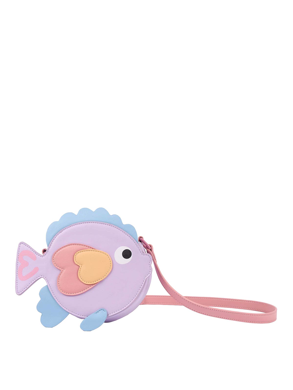 Blue and pink fish-shaped bag with zip and removable shoulder strap