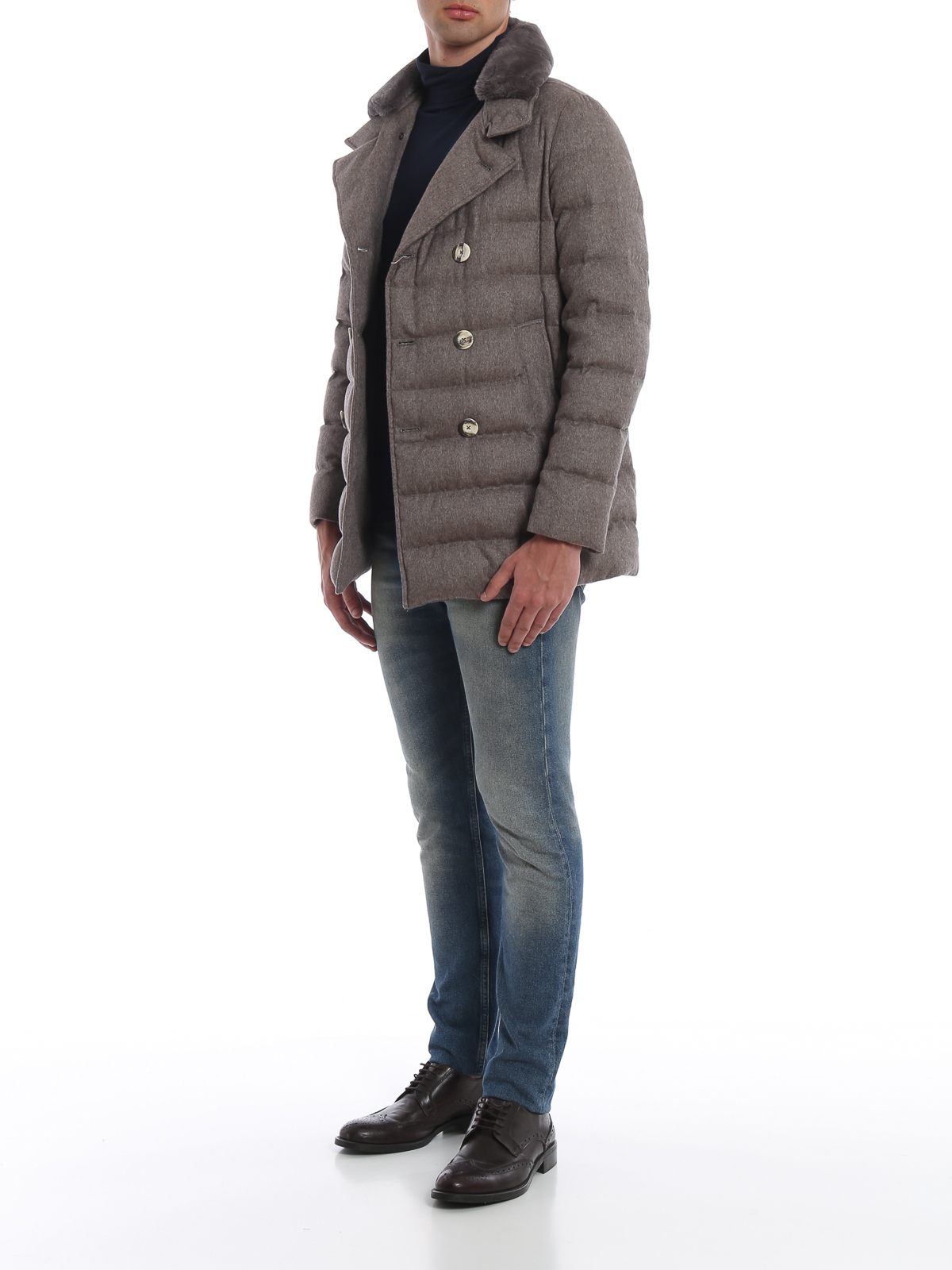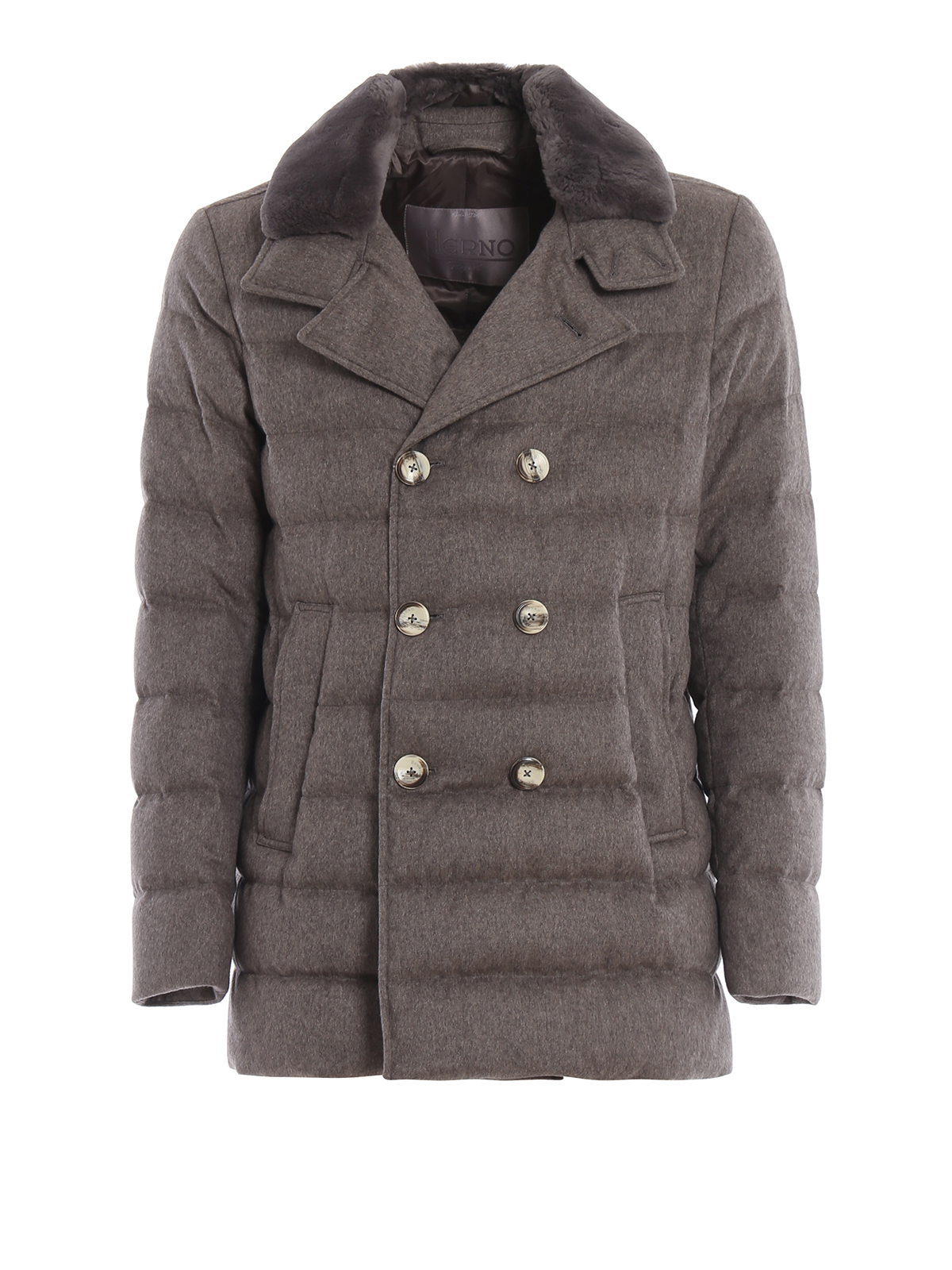 Cashmere and silk eco water repellent treatment PFC free double-breasted padded jacket detailed with real fur removable insert at collar, notched lapels, snap vertical pockets, two inner pockets one with button and a zipped one. Herno Resort collection.