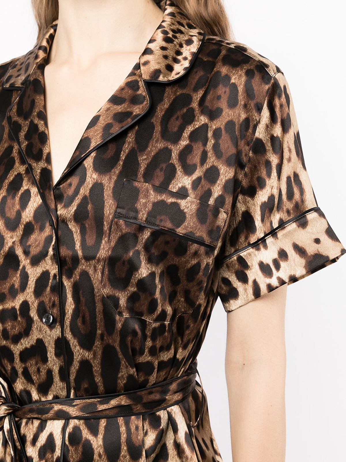 Brown/black silk-blend leopard-print tie-waist shirt from dolce &gabbana featuring stretch-silk, all-over leopard print, camp collar, front button fastening, chest patch pocket, short sleeves, turn-up cuffs and tied waist.