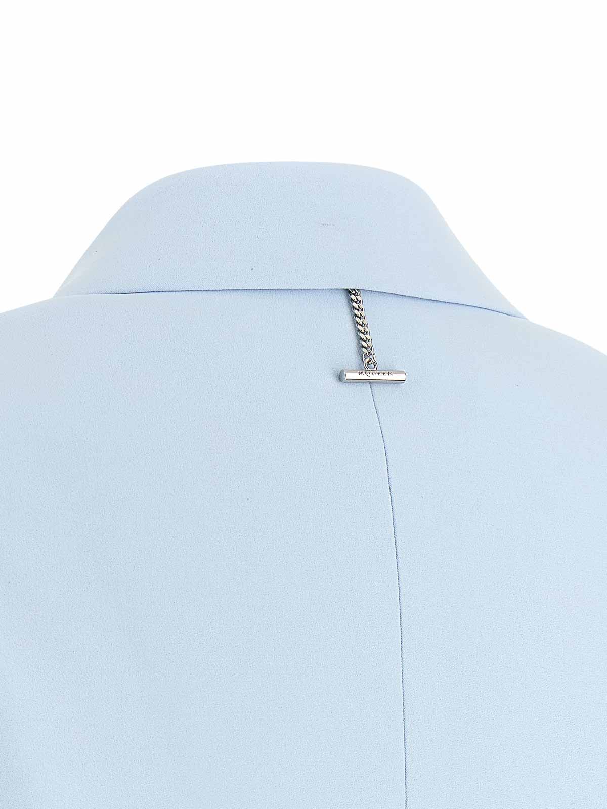 Single-breasted thin crpe blazer with front button closure, hourglass silhouette, mirror lapels, breast pocket, flap pockets, structured and padded shoulder strap, long sleeves, chain with metal t-detail and back split, lining.