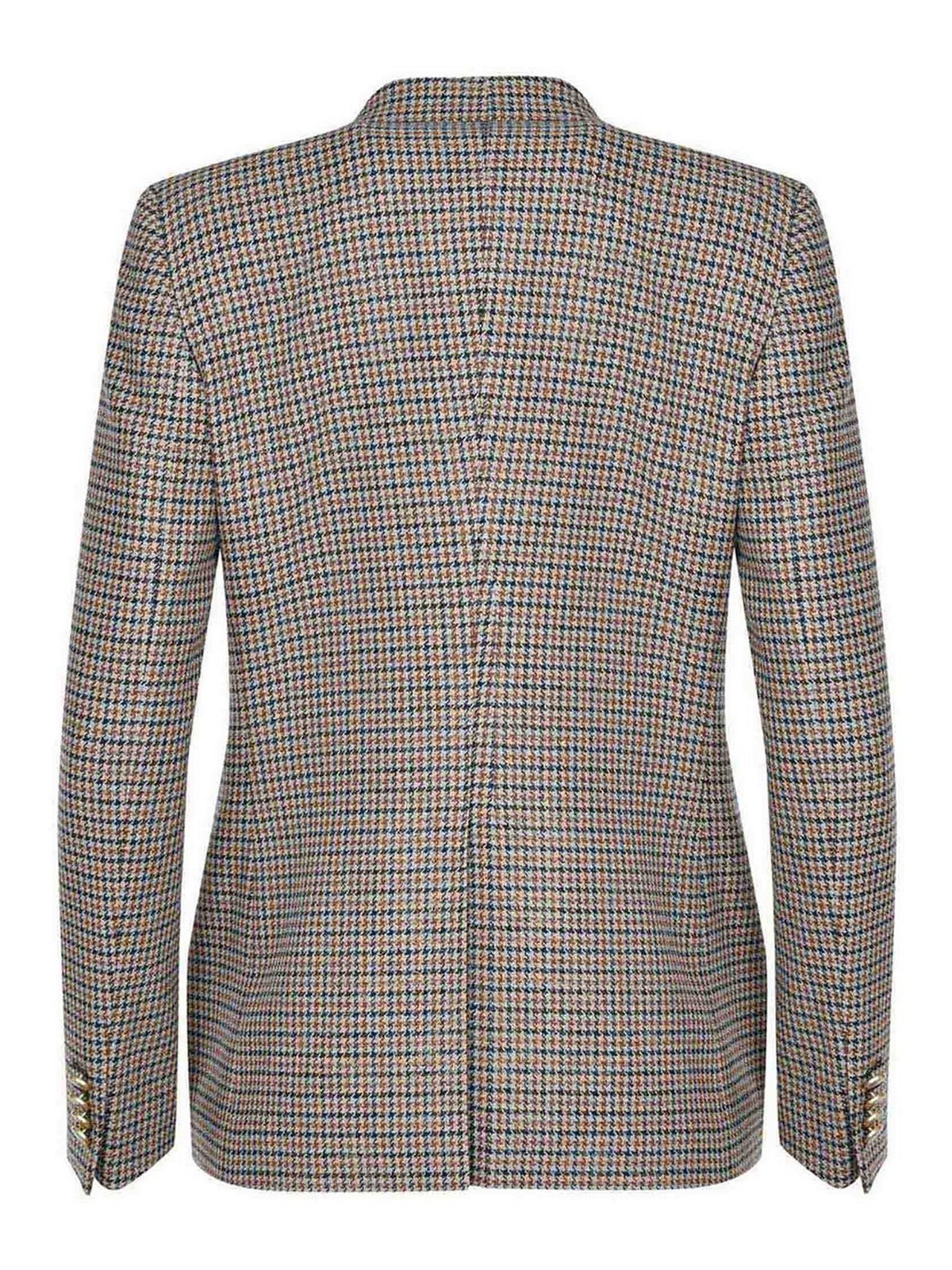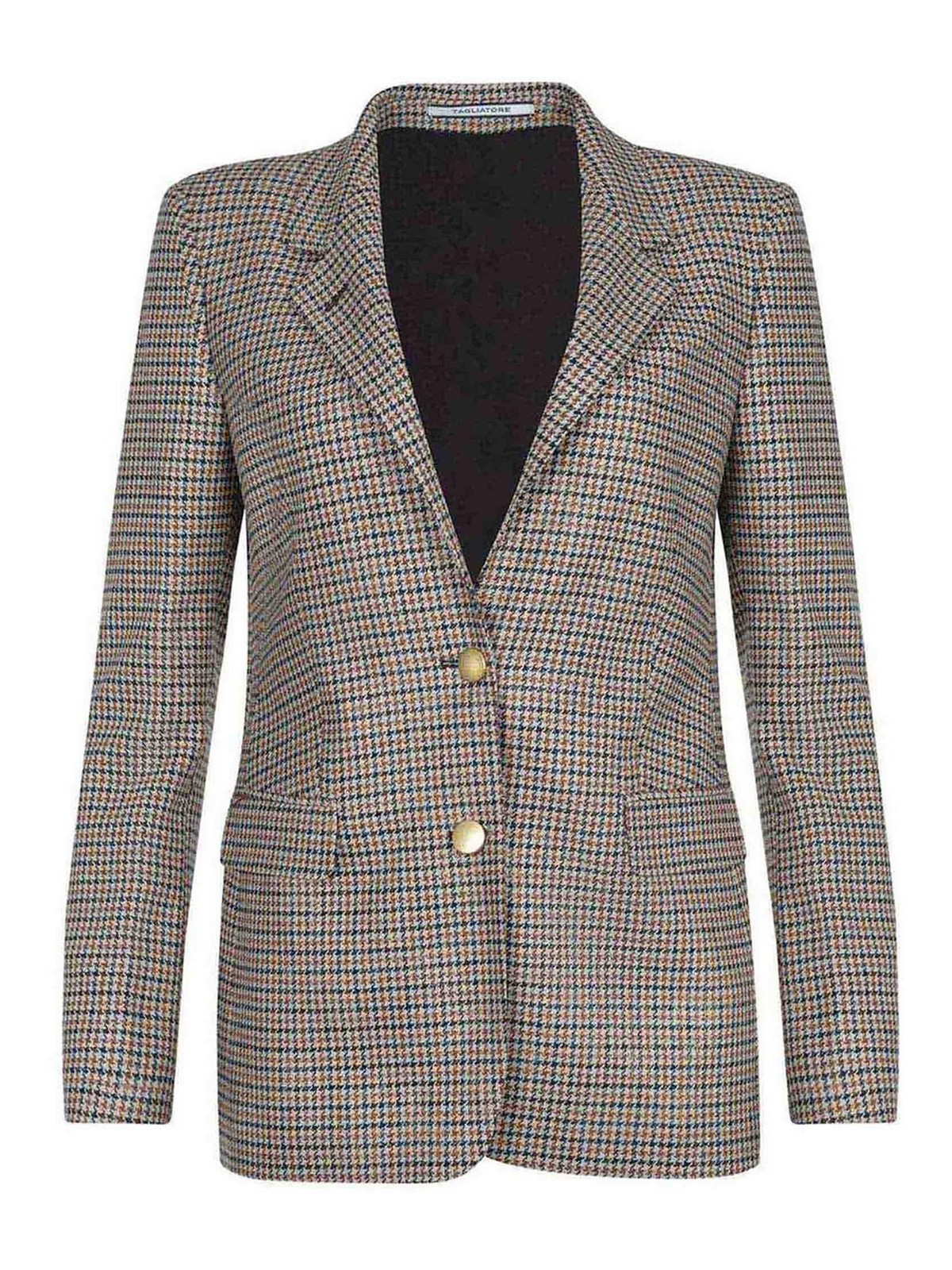 Tagliatore j-parigi single-breasted jacket in beige wool blend. houndstooth pattern. notched lapel. chest welt pocket. long sleeves. cuffs with four buttons. single-breasted. closure with two gold buttons. side flap pockets. center vent at the back. lined. lining 100% cupro. 40% acrylic, 30% wool, 20% polyester. made in italy.