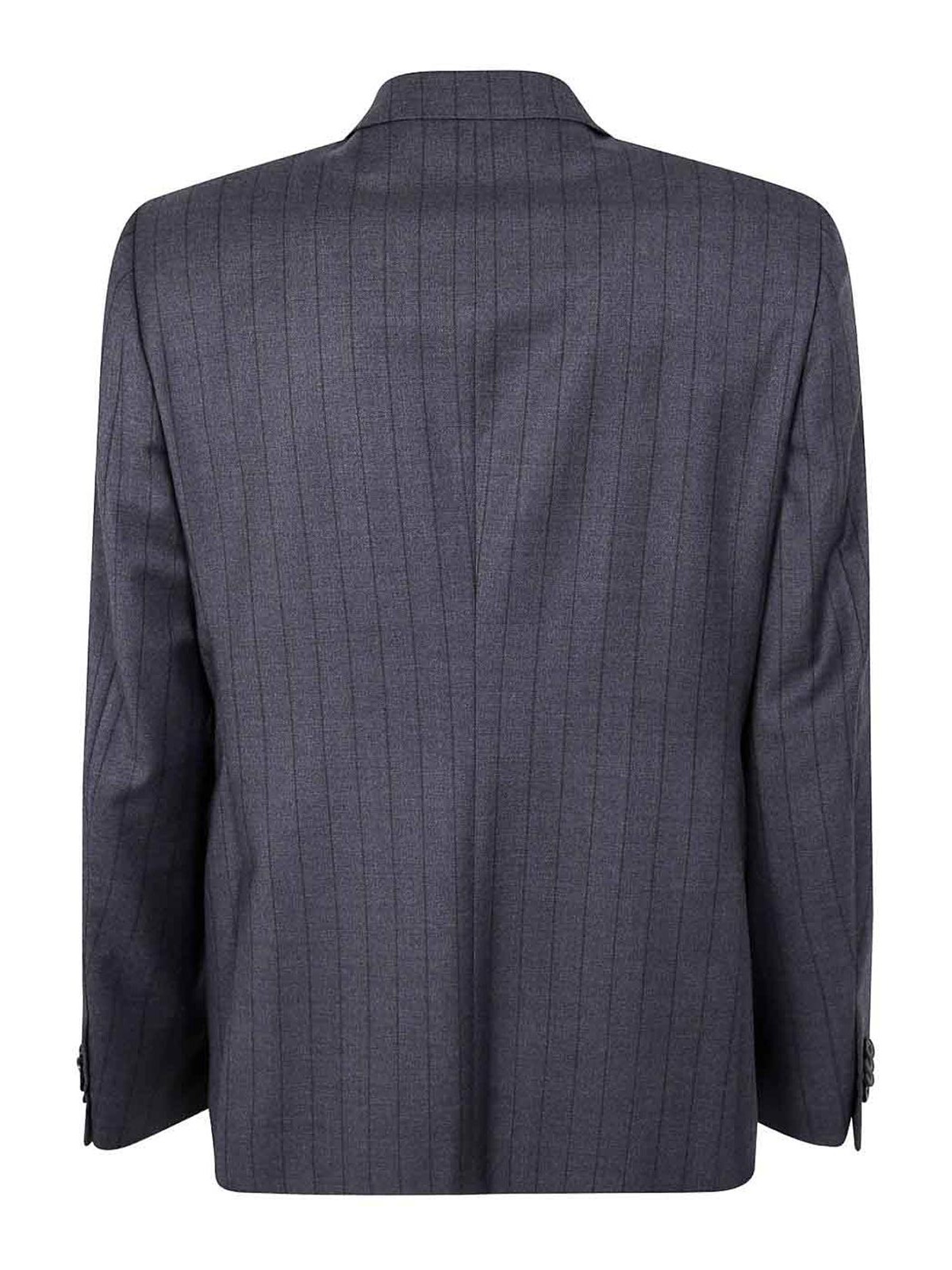 Features gray pinstripe front with button placket, long sleeves, front button fastening and zip side welt pockets