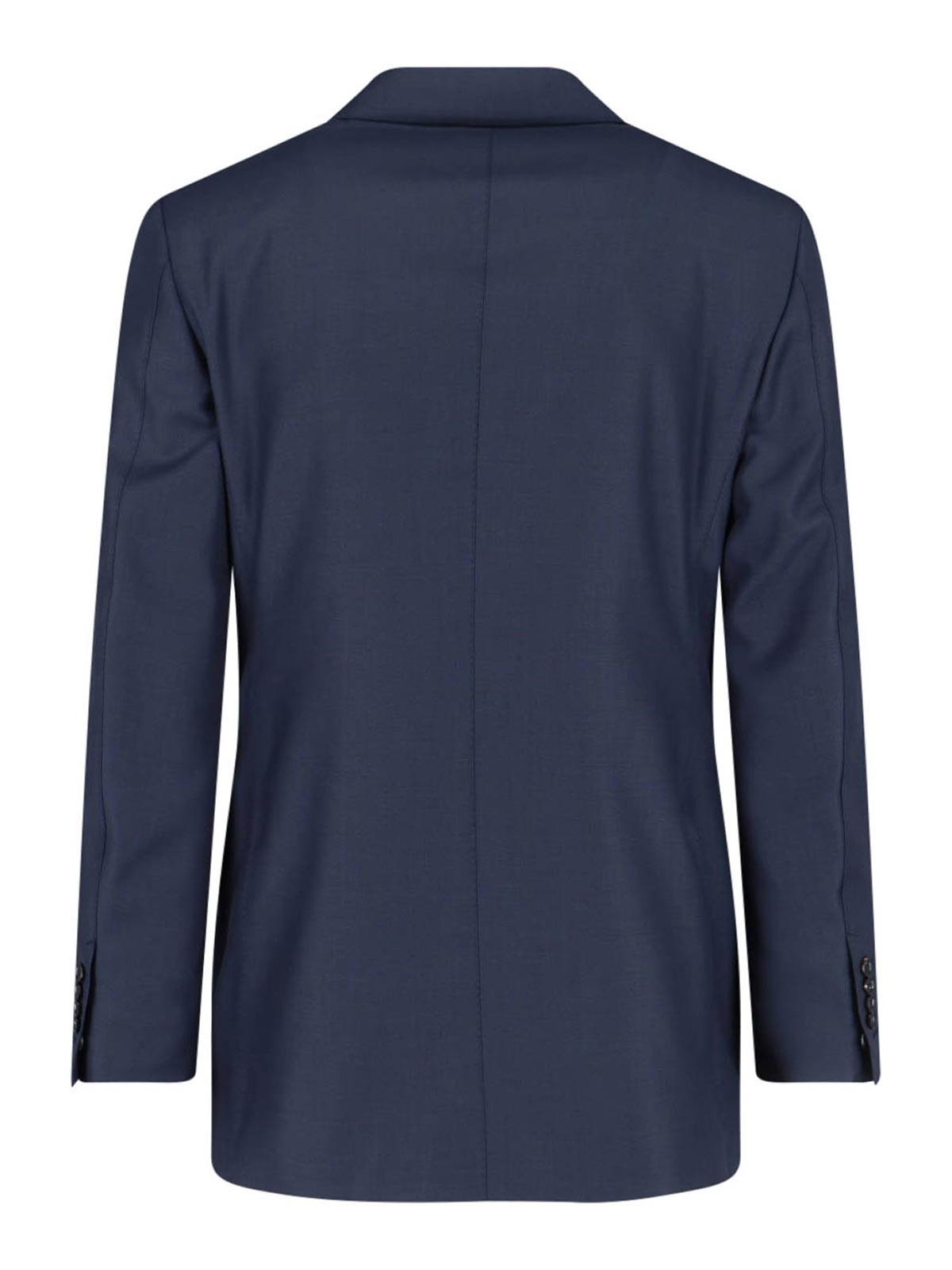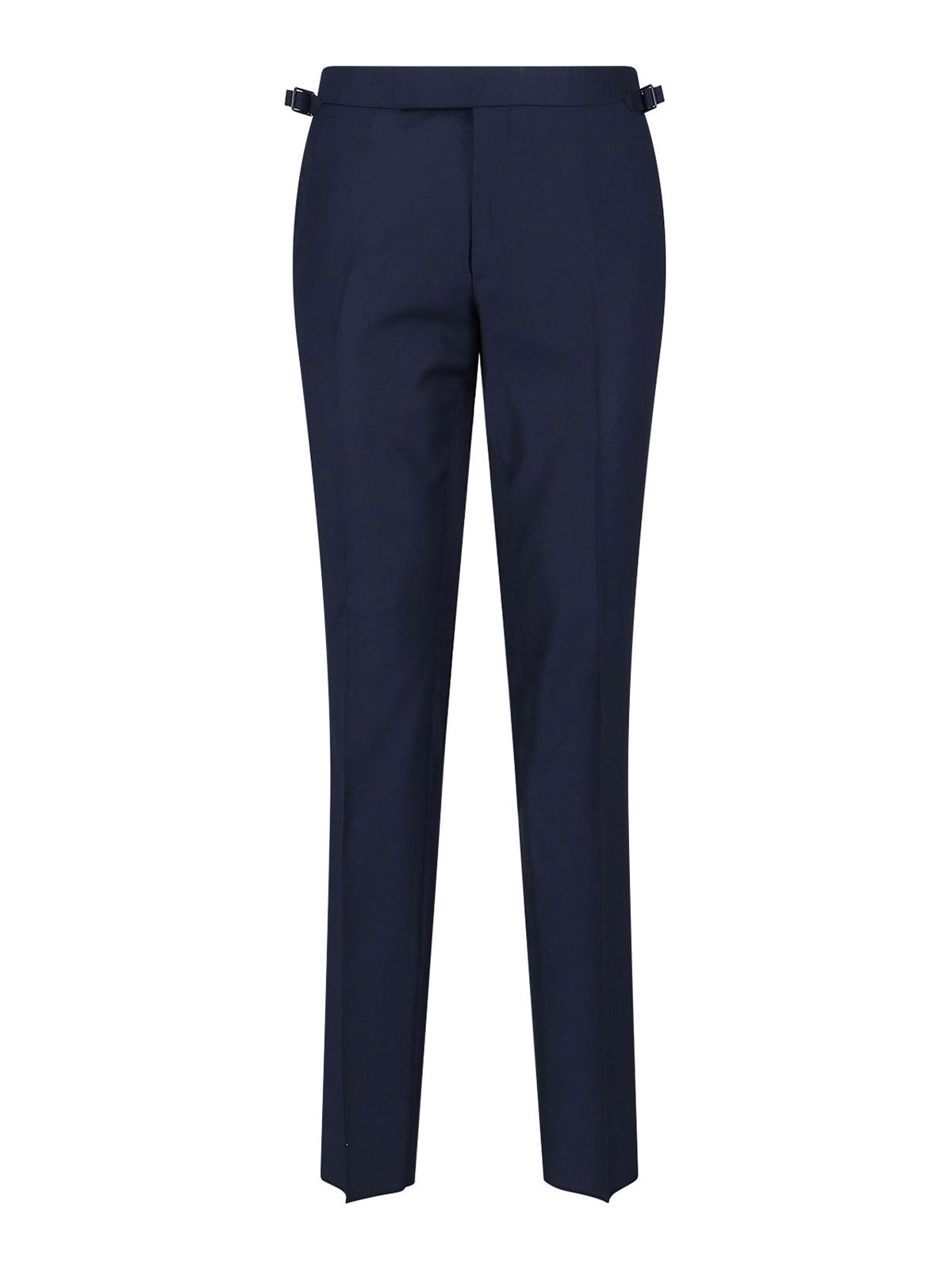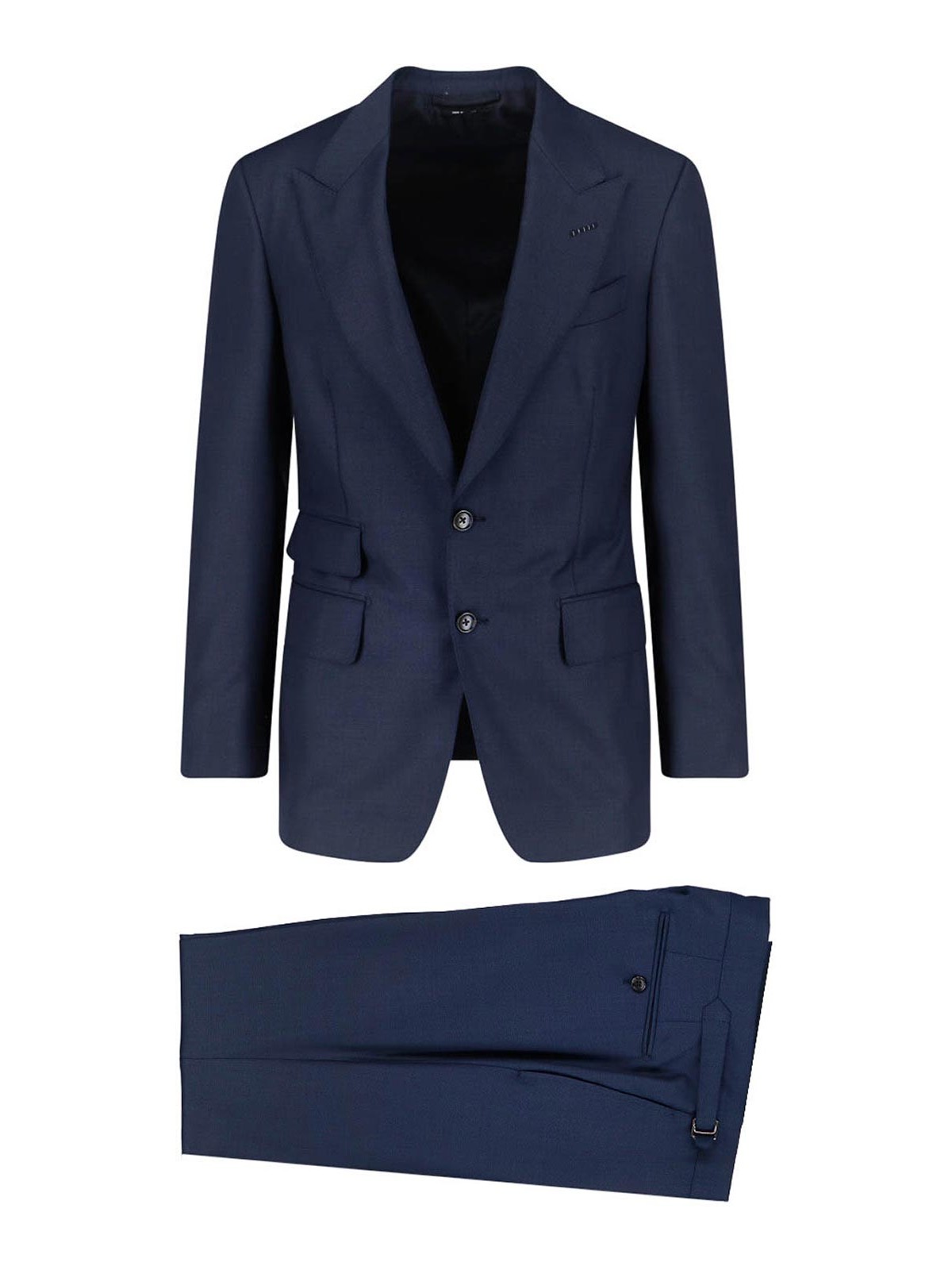 Tom fod shelton single-breasted suit in blue wool, navy tone, notched lapels, single-breasted front button closure, long sleeves, three front flap pockets, one chest pocket, button cuffs, straight hem, tailored trousers, zip and hook closure, two back welt pockets, straight leg.