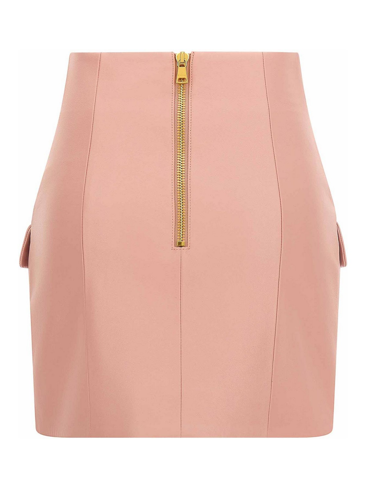 Lamb leather mini skirt with metal 'testa di leone' buttons, front flap pockets, back zip closure, lining.
