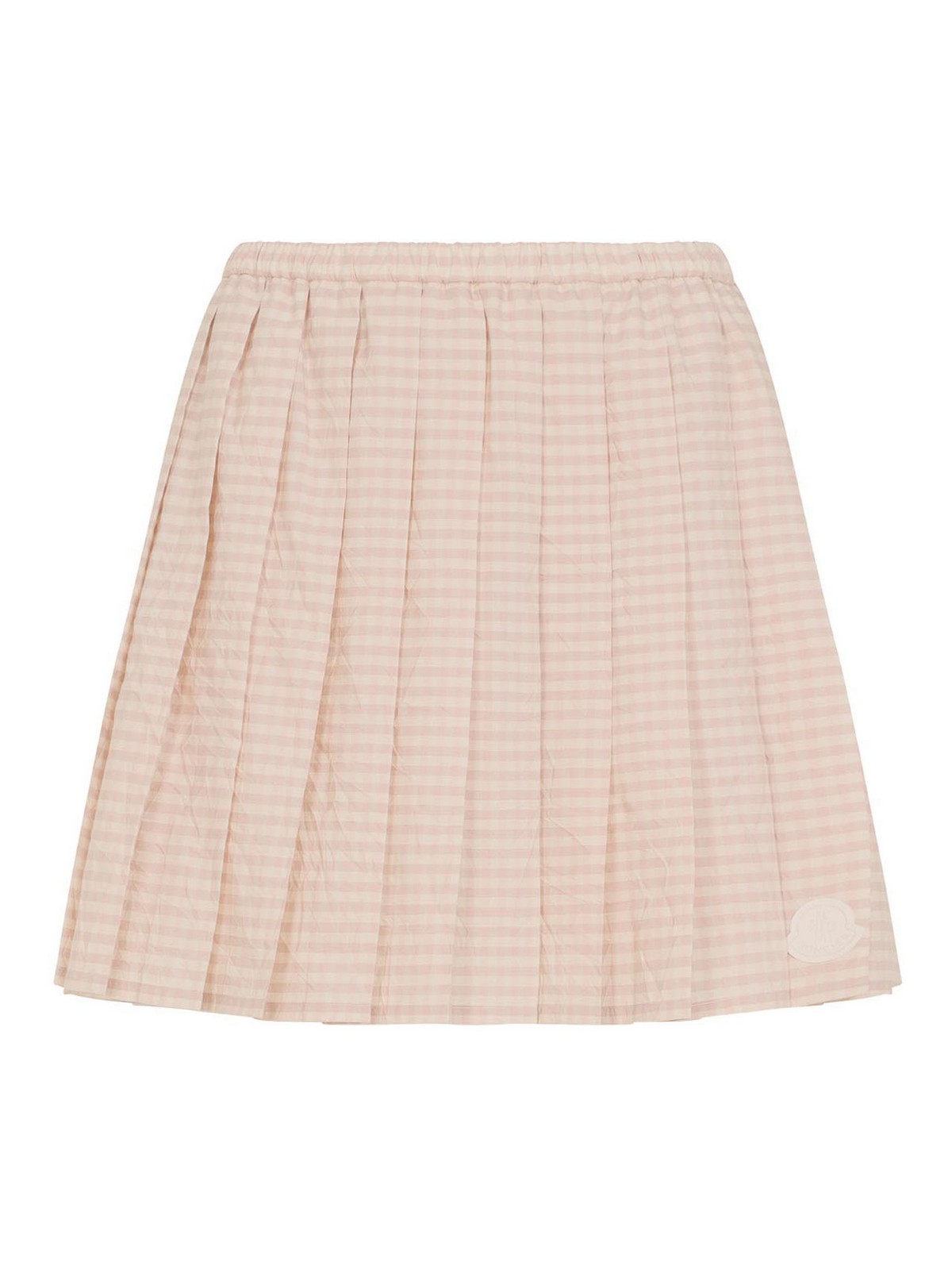 Moncler pink cotton skirt. crafted in cotton and polyester blend. elastic waist, pleated design, side patch logo, straight hem. white and pink checked pattern all-over.