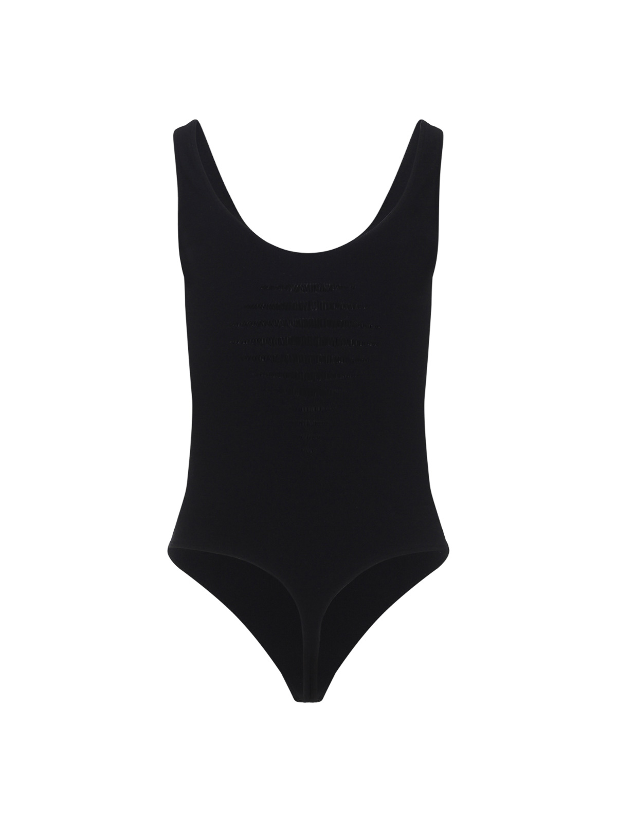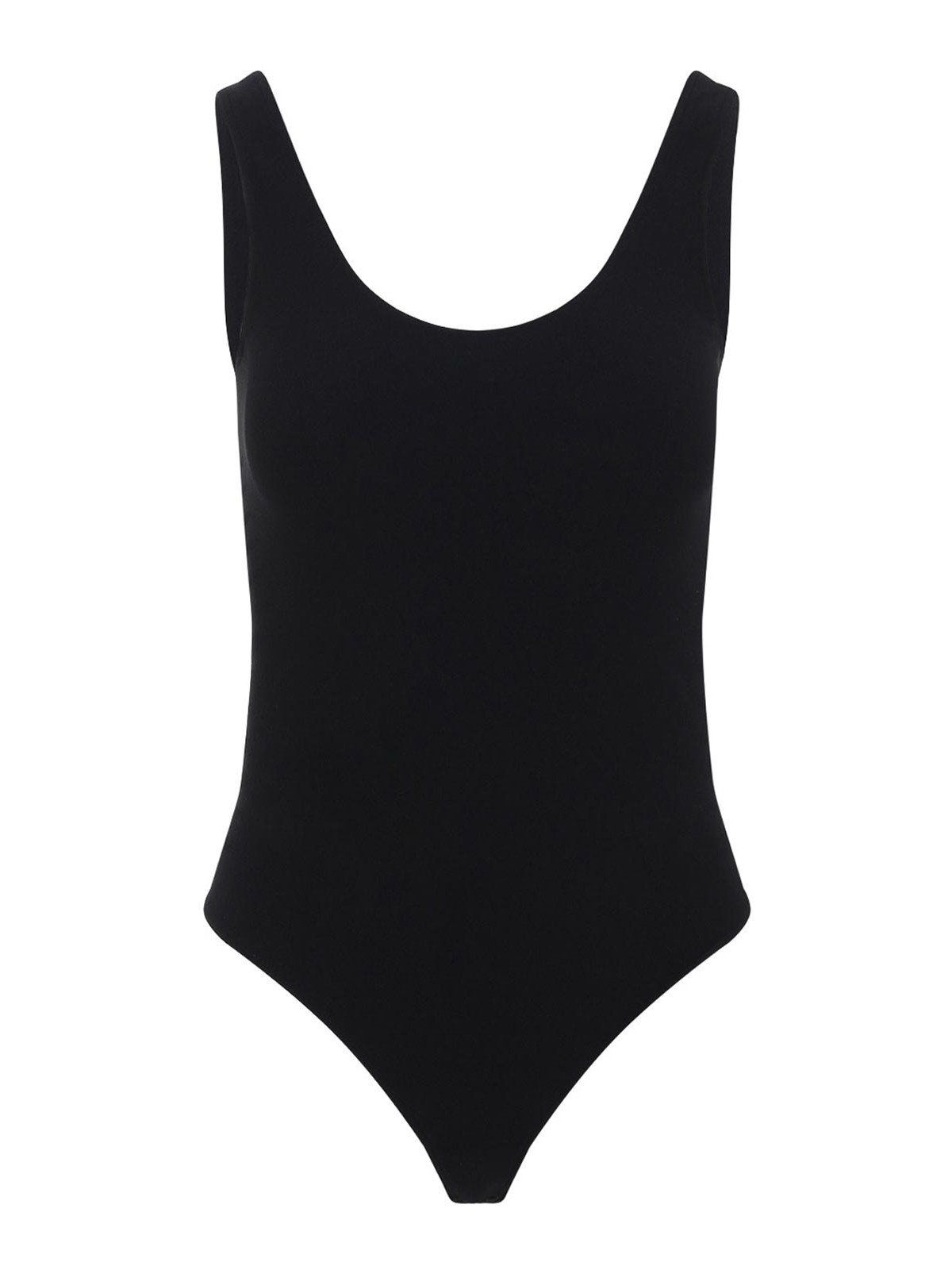 Wolford black slash string body. crafted in polyamide and elastane blend. round neck, sleeveless, round back, back perforated details, tonal stitching.
