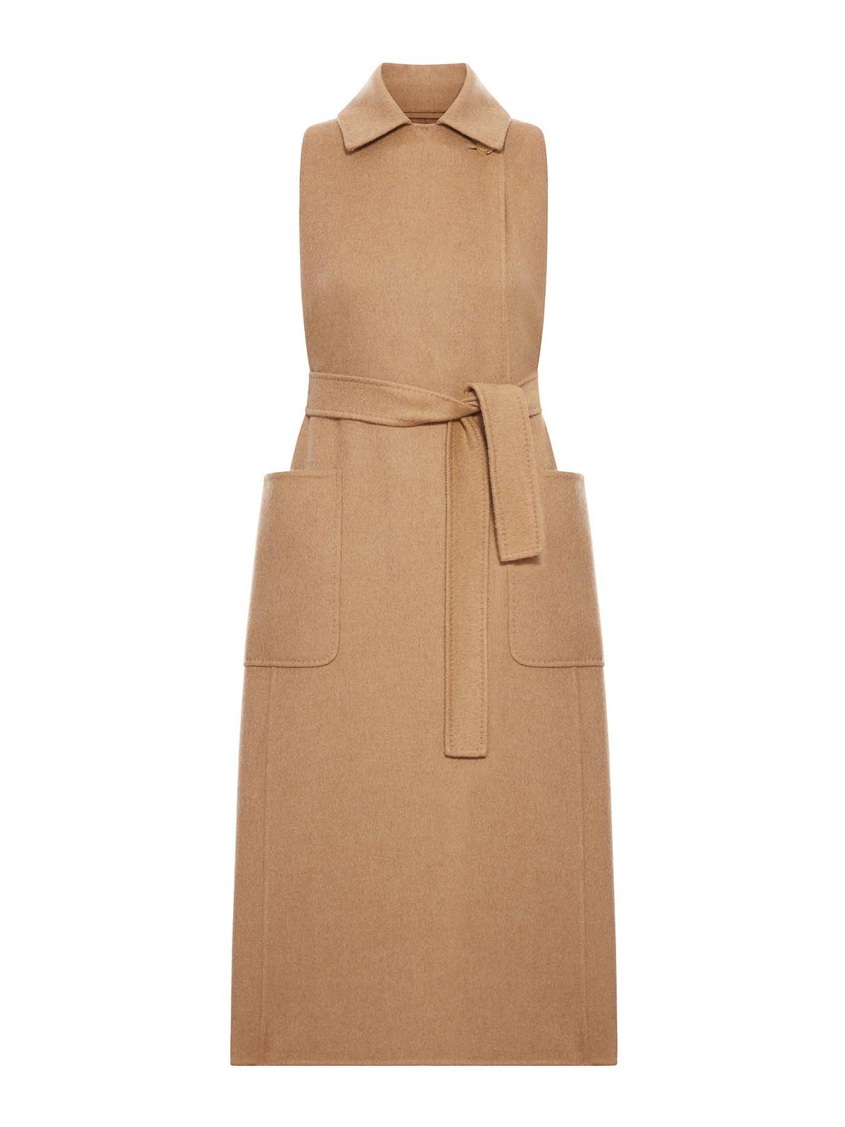 Long sleeveless coat, robe silhouette, hand, stitched double, drap baby, straight fit, lapel collar, matching belt at the waist, patch pockets, center back vent, unlined, color
