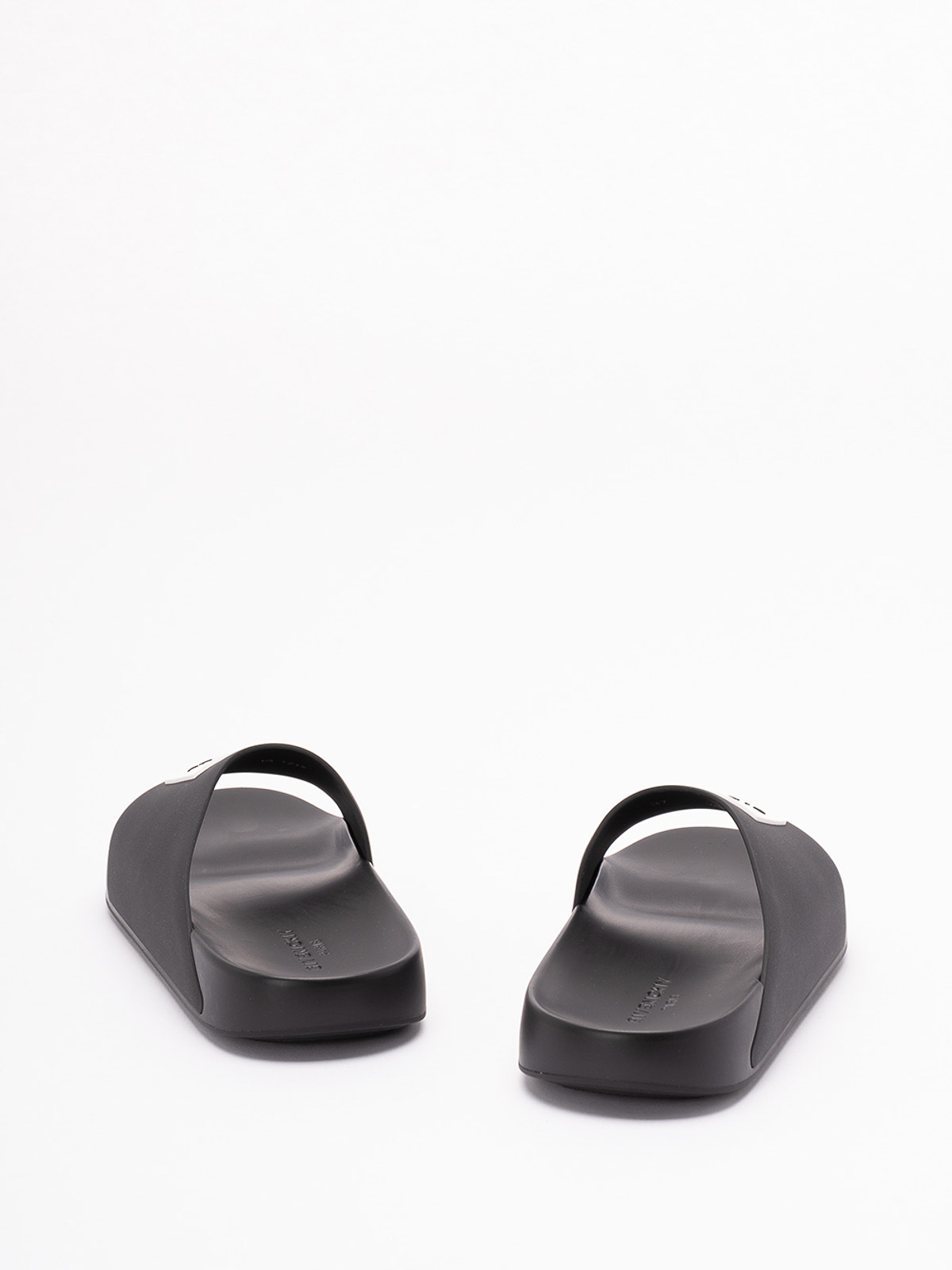 Rubber slides with shaped band and embossed logo, flat sole and essential design designed for everyday use.