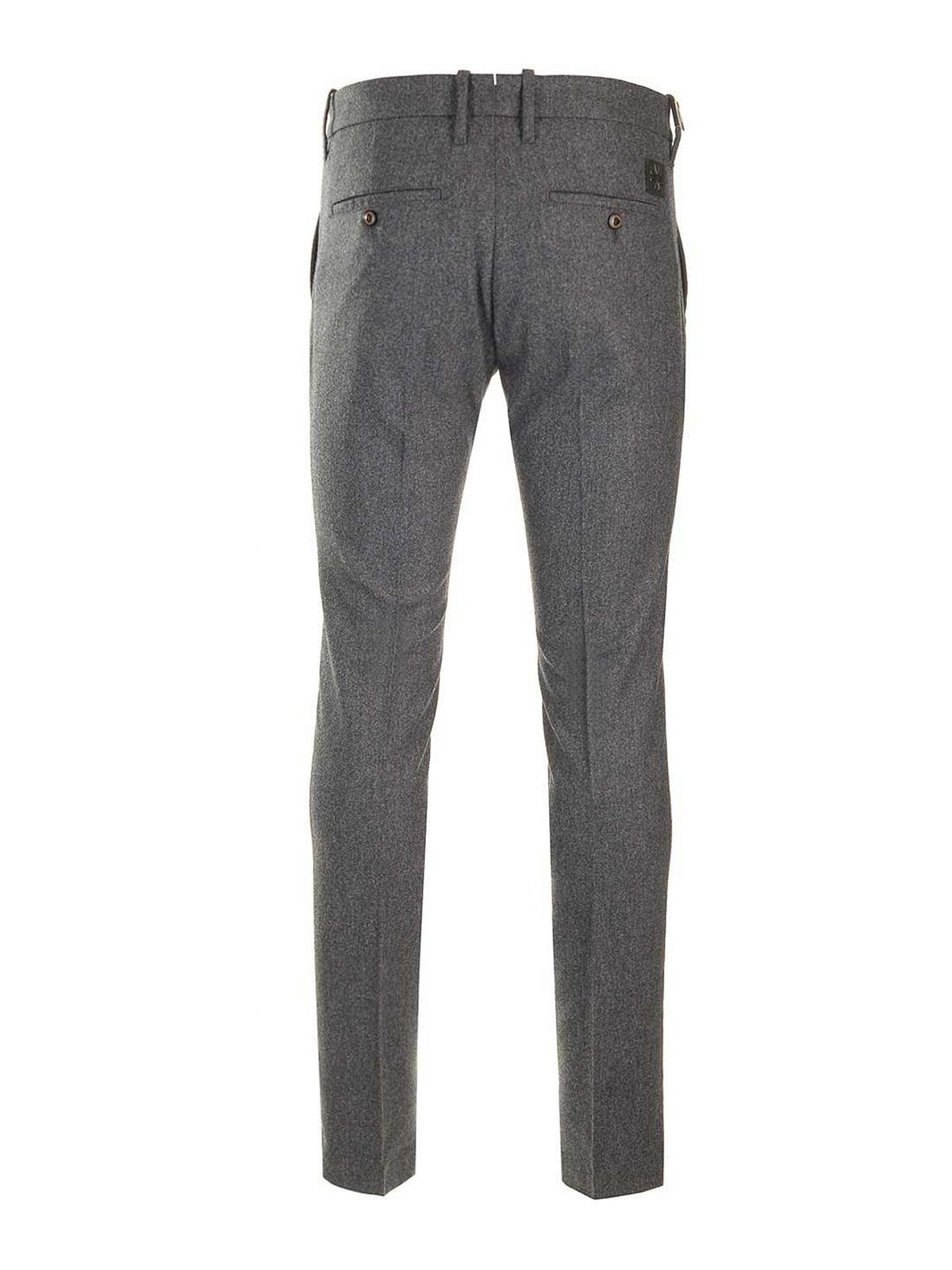 Slim fit bobby trousers low waist belt loops slash pockets on the sides welt pocket on the side back welt pockets with button button and covered zip fastening