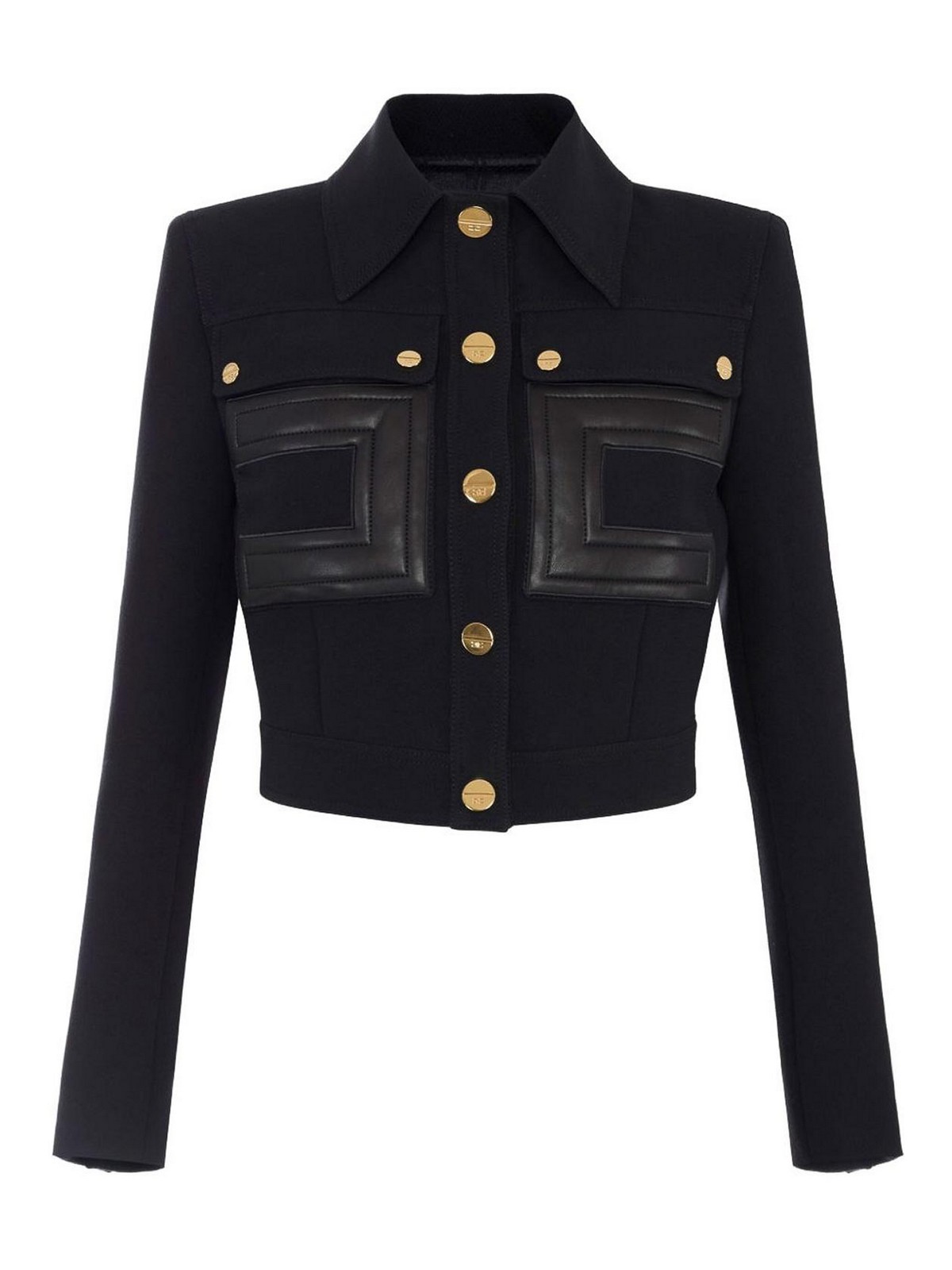 Crop jacket with collar and long sleeves, contrasting buttons and eco-leather logo.