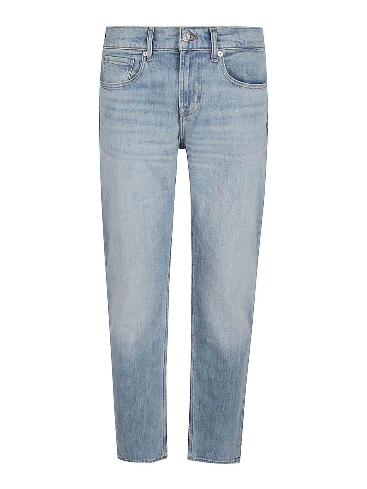 Stretch denim slim-tapered jeans by 7 for all menkind, mid-rise, zip and button closure, belt loops, five-pocket design, skinny fit.