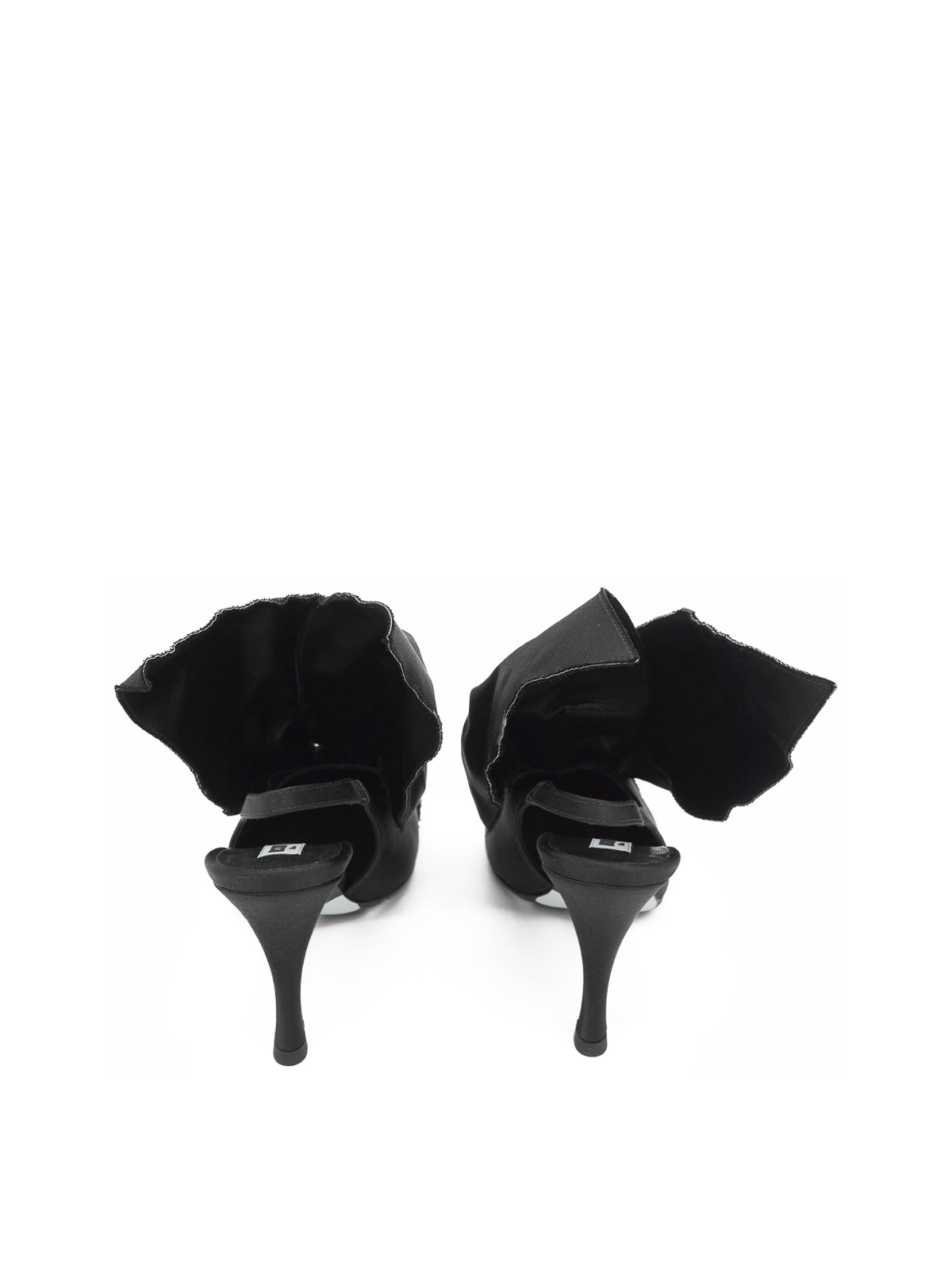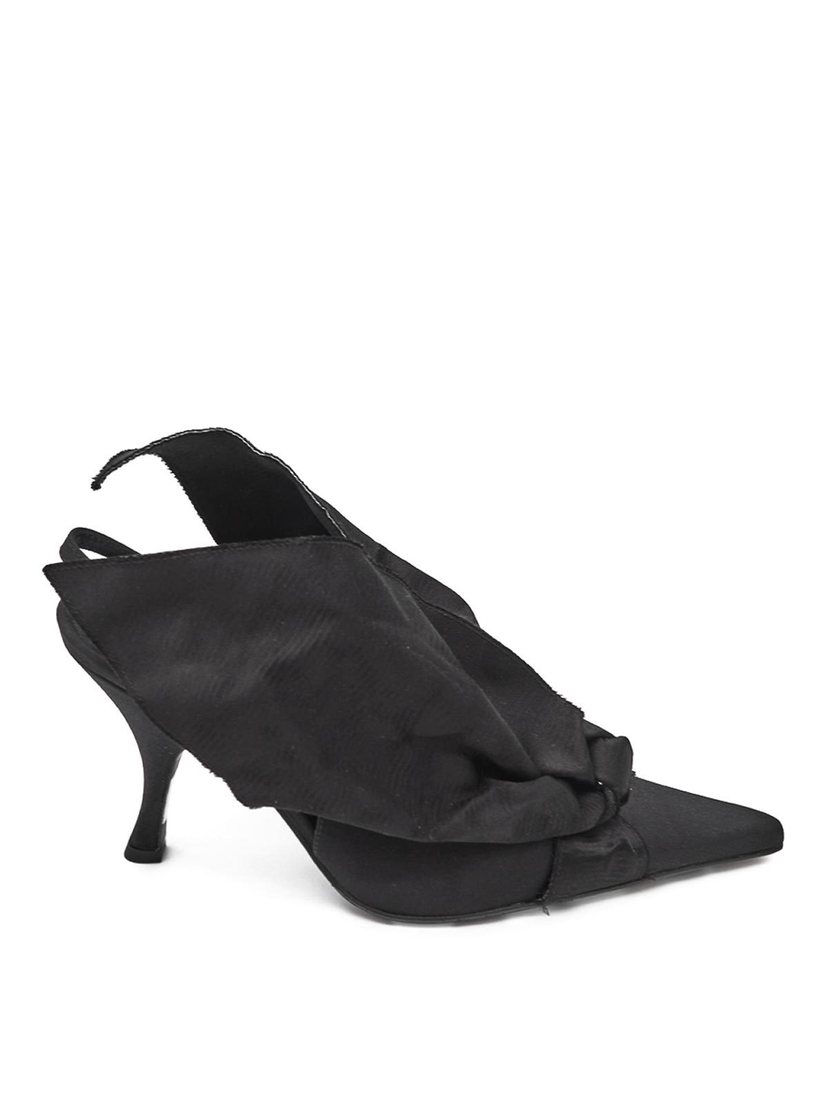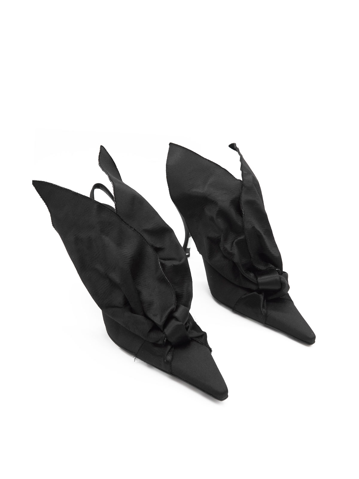 Rabbit slingbacks in black. Moschino slingbacks with a tapered toe and a strap on the back, featuring a satin finish and an oversized bow detail. Tapered toe, strap on the back, satin finish, oversized bow detail, and a polka dot sole.