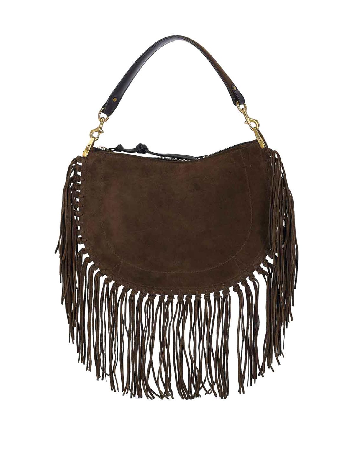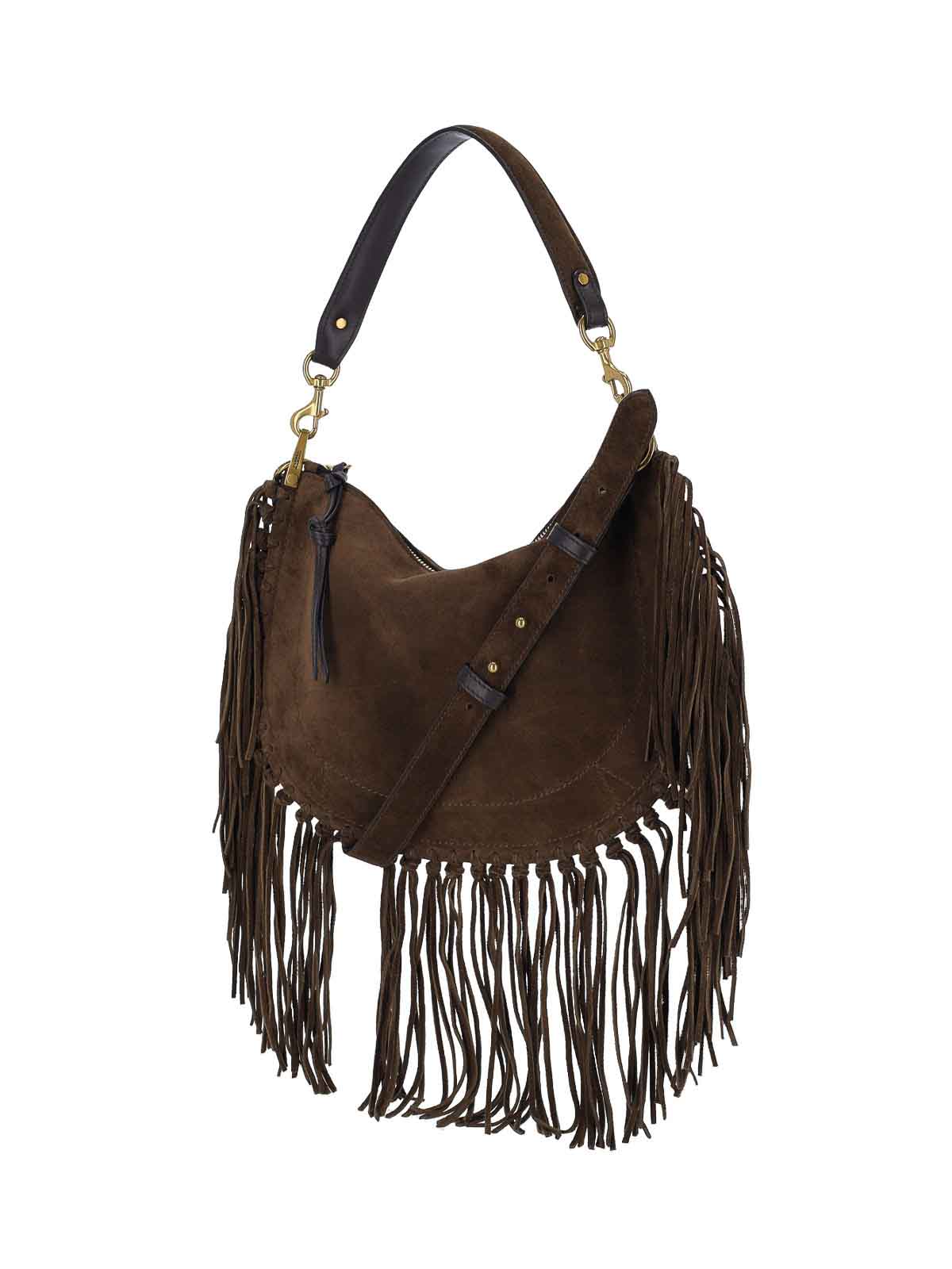 Small oksan soft Isabel Marant bag, in brown suede, dark shade, removable handle, adjustable and removable shoulder strap, zip closure, all-over fringe detail, tone-on-tone logo on the front, one internal compartment.
