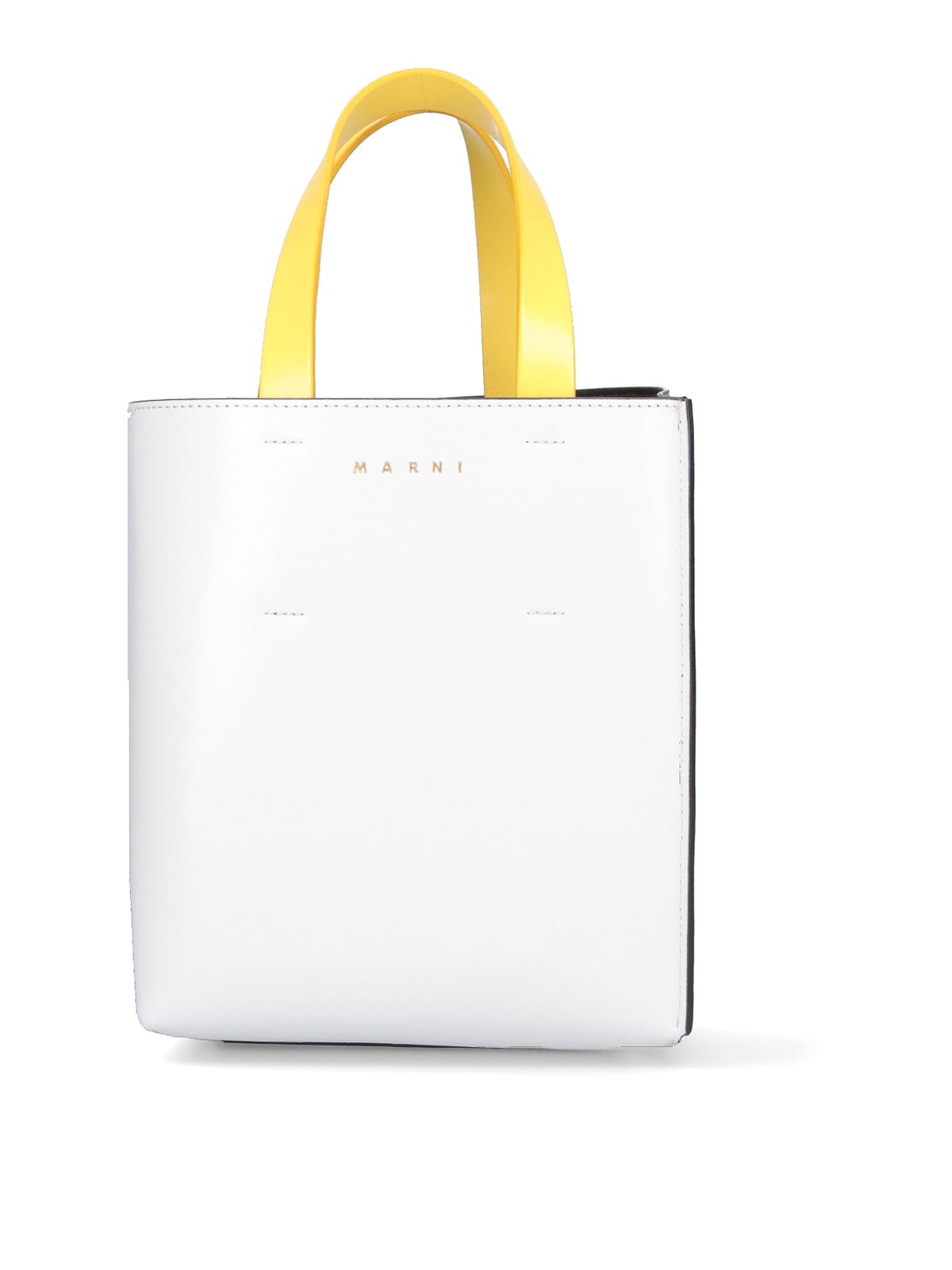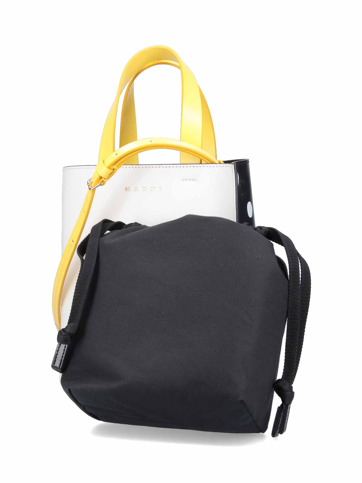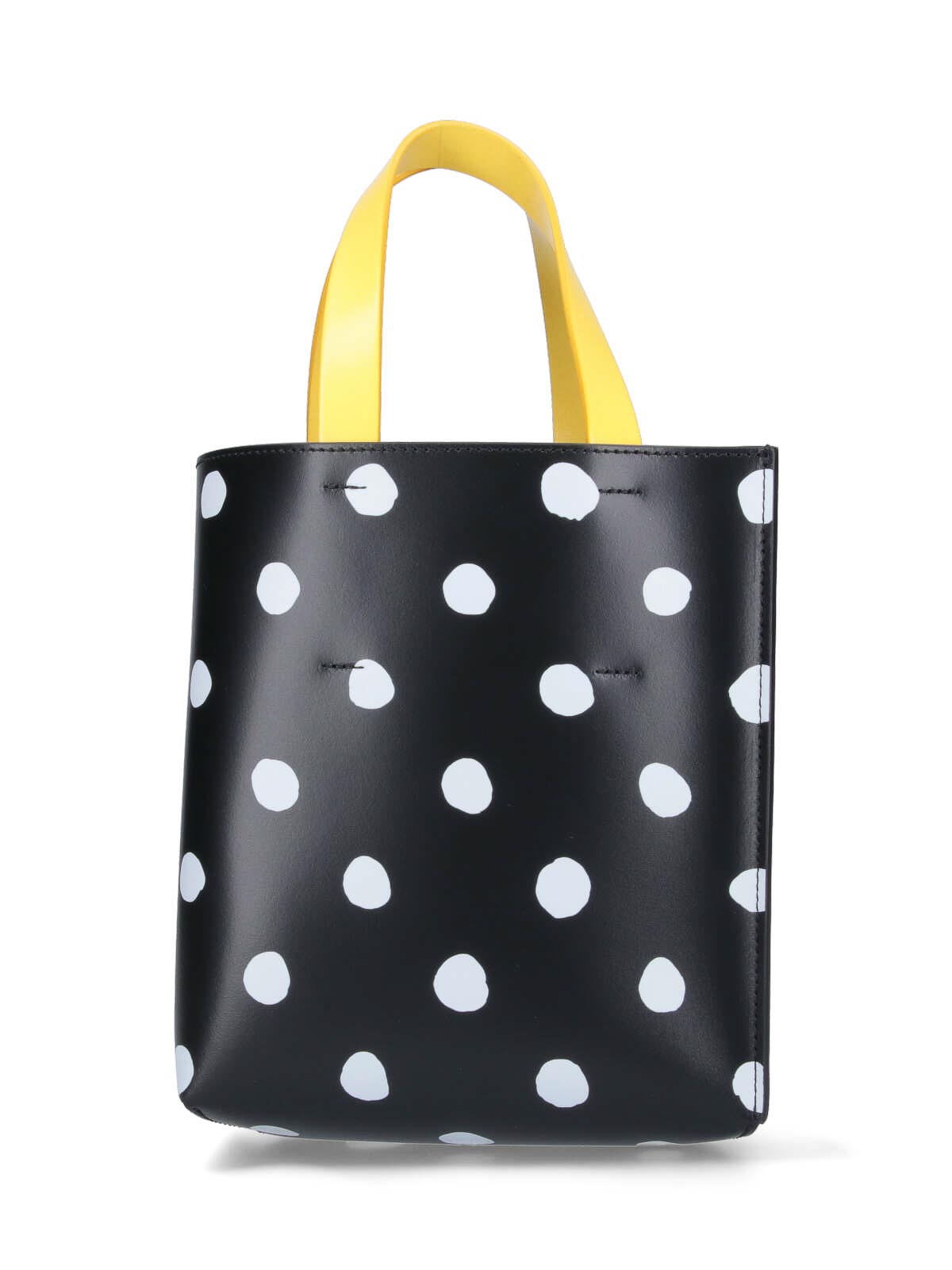 Marni museo small bag in black white polka dots on one side white on the other two yellow top handles one removable adjustable one front logo lettering print one main compartment
