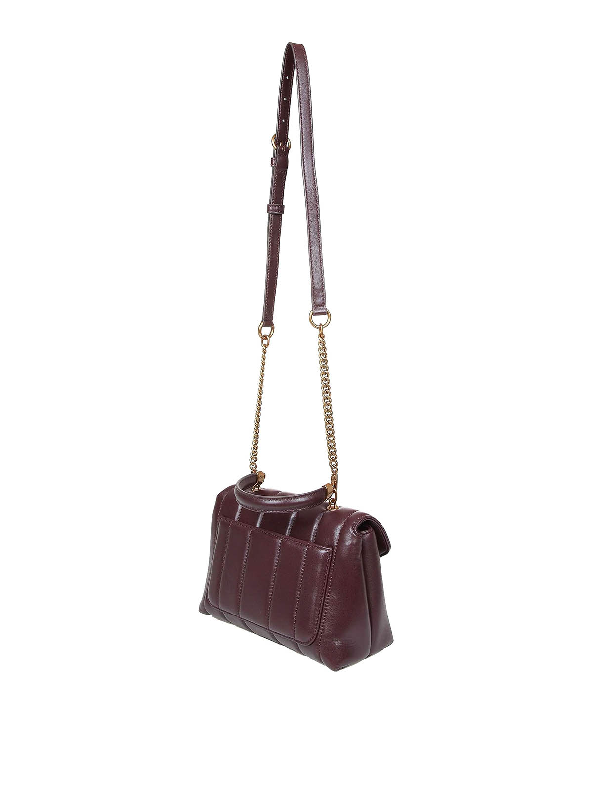 Small quilted leather handbag featuring adjustable and removable shoulder bag, two compartments, rear patched pocket, zipped partition and flap fastening.