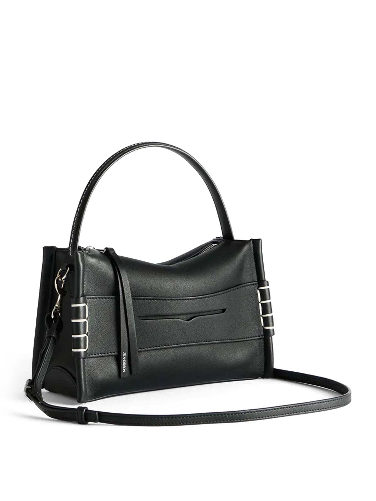 Small leather loafer bag, loafer bag in soft black calfskin, compact silhouette, featuring a top handle and removable shoulder strap, silver hardware, the base replicates the sole of a moccasin, embossed logo, 100% leather, color: black