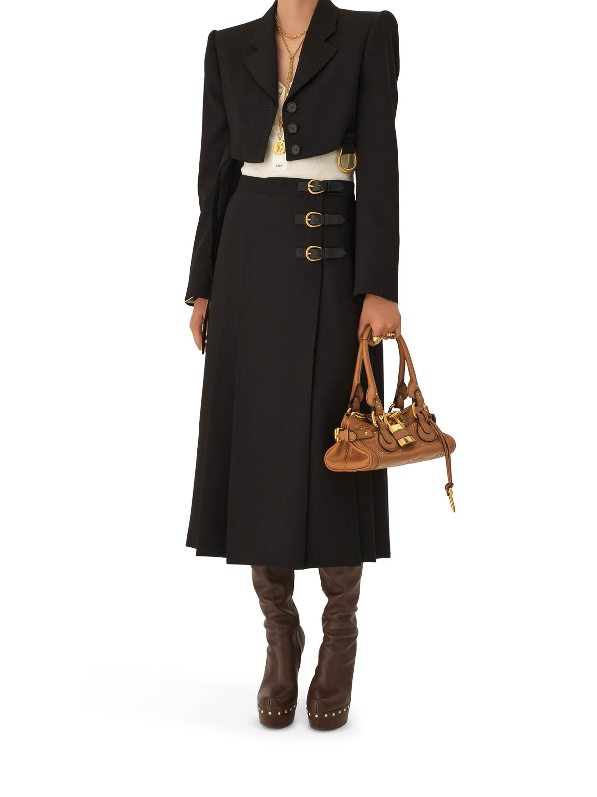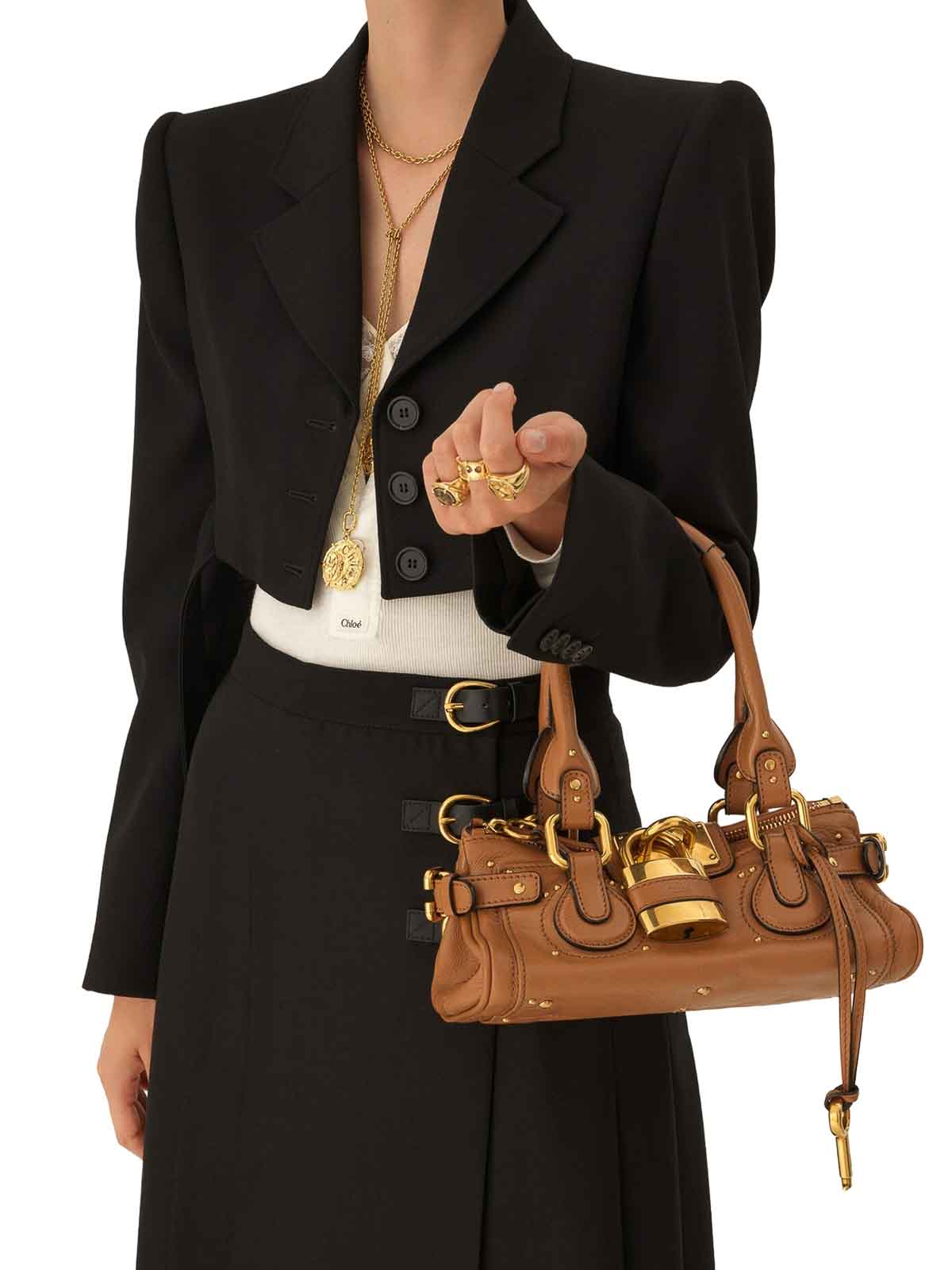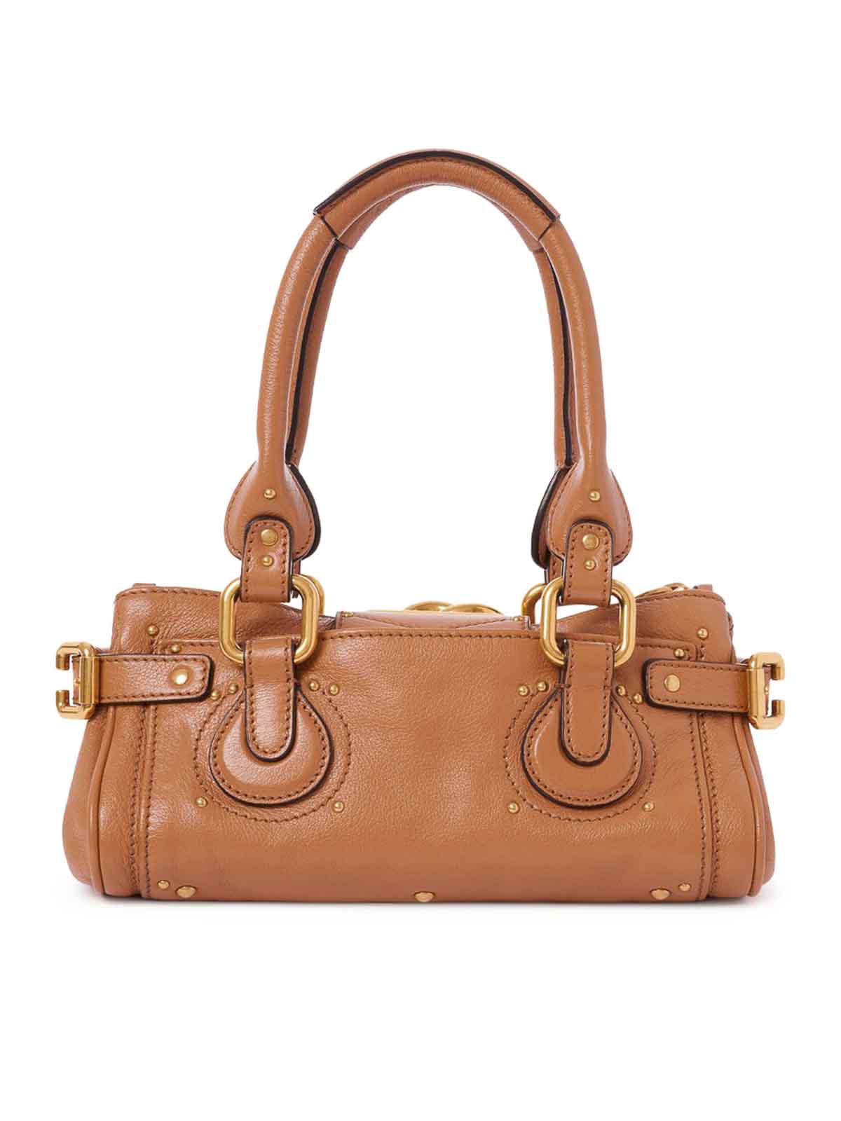 Small paddington bag in grainy leather, grained buffalo leather, main material: buffalo leather, main lining: cotton, pocket lining: calfskin, lock: aluminum, carrying style: handheld or shoulder carry, 1 main compartment, 1 flat front pocket, 1 flat back pocket, 1 internal zip pocket, zip closure, model comes with a dust bag, width: 26 cm, height: 12 cm, depth: 12 cm, handle drop: 18 cm, color: mustang brown