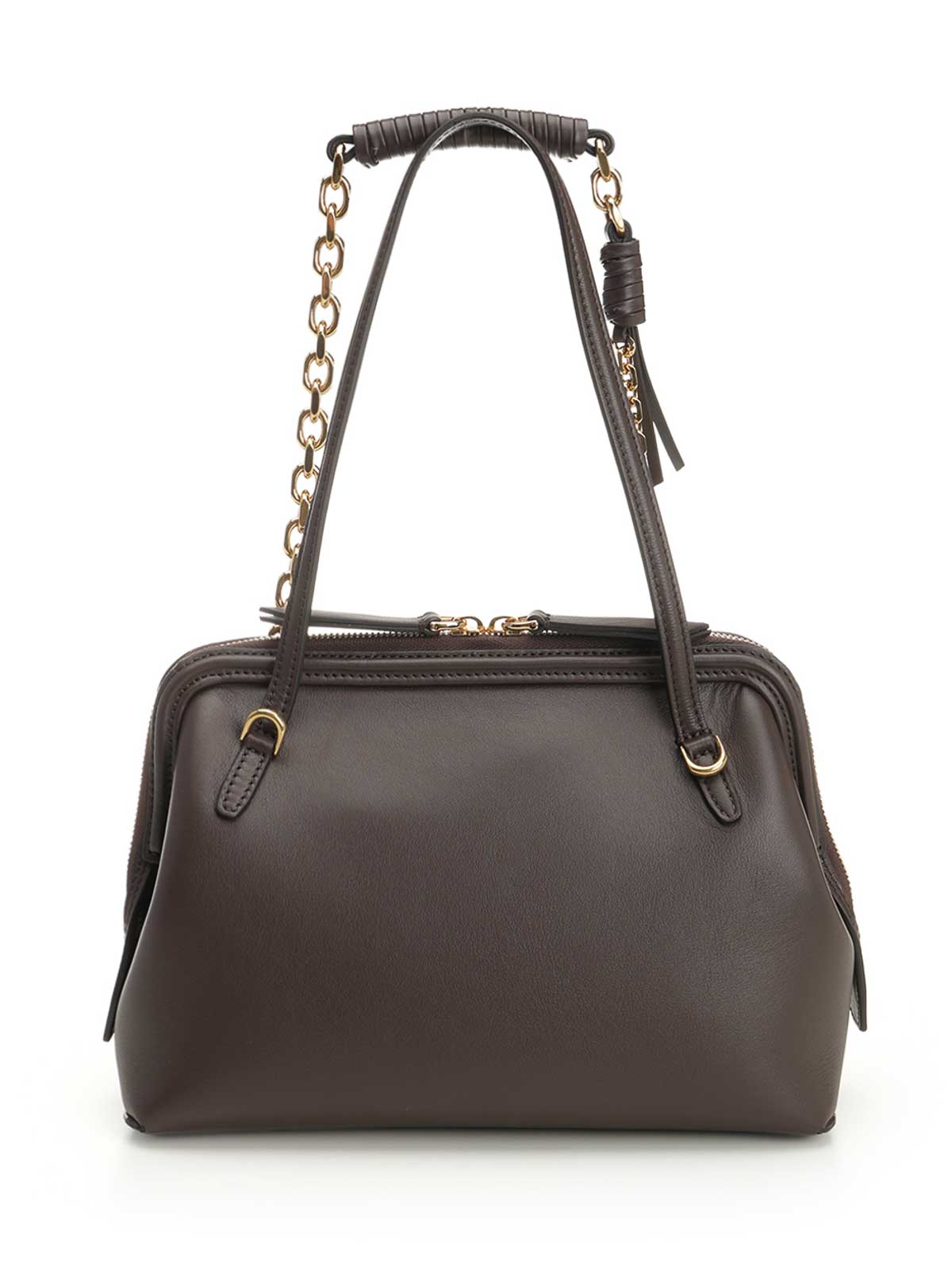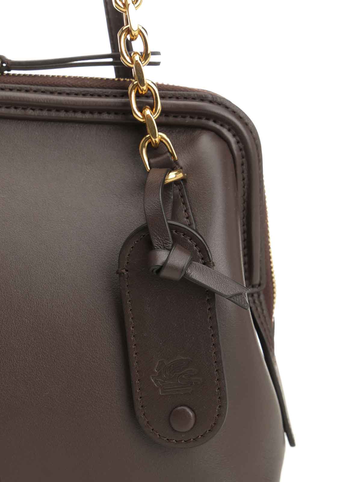 Small doc shoulder bag in calfskin from etro, with mismatched handles, one in leather and one in chain with tubular leather inserts, completed by a leather tag holder with embossed pegasus logo, zip closure