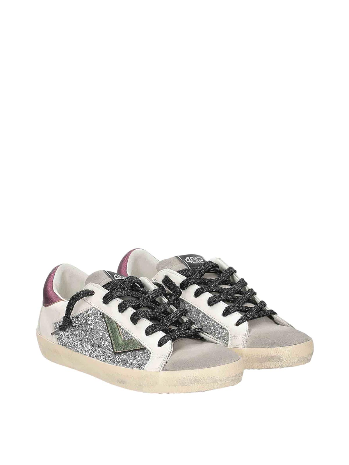 4b12 women's sneaker suprime d328 silver purple women's sneaker by 4b12, handcrafted in Italy with a combination of materials that combines style and comfort. the silver glitter upper gives a bright and distinctive touch, while the gray suede toe cap adds a sophisticated and contemporary note. the cotton terry lining ensures breathability and softness, ideal for daily use. The design is completed by the rubber sole and the removable internal footbed, which guarantees comfort and practicality. a sneaker with a strong character, perfect for those who love to stand out with style.