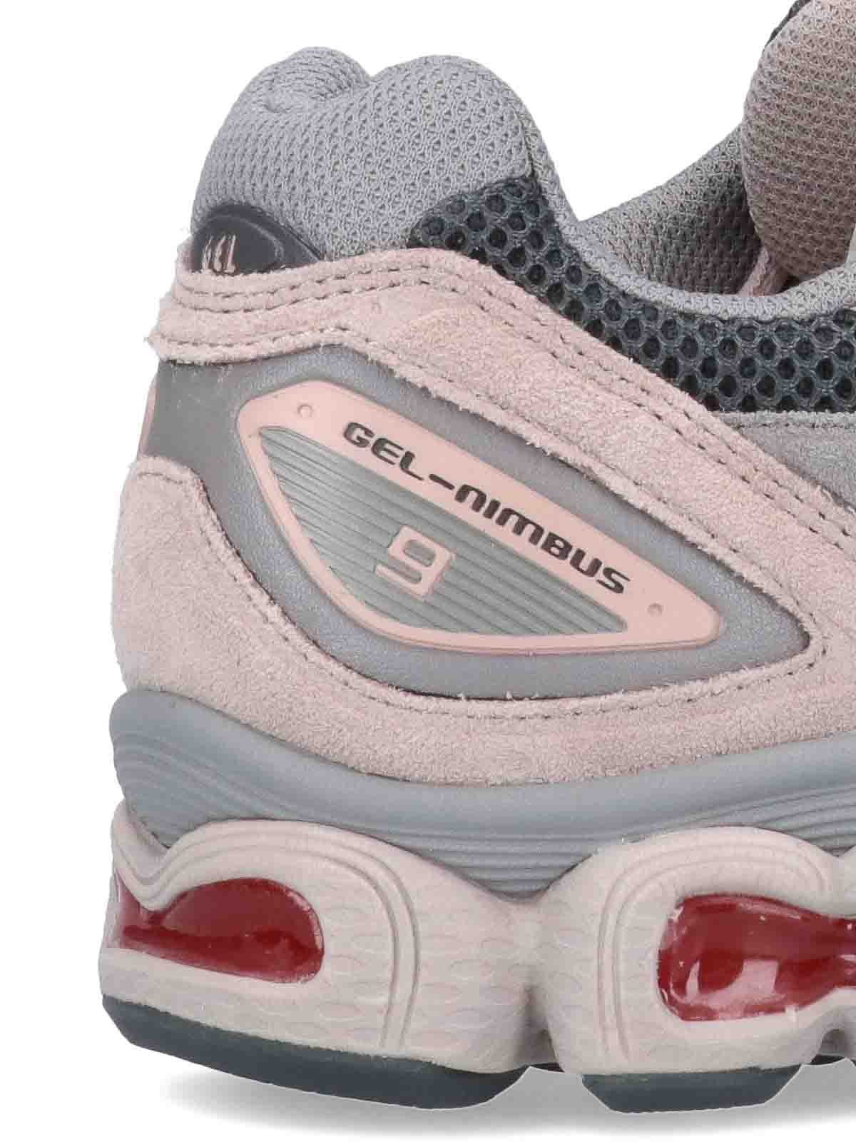 Asics gel nimbus sneakers in gray and pink mesh laces iconic gray side stripes tab back logo red interschool cushioned gel