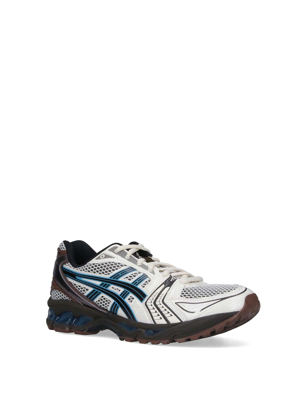 Asics gel-kayano 14 sneakers, in cream and brown fabric, blue details, round toe, lace closure, logo patch on tongue, side mesh inserts, side logo print, embossed logo on rear tab, textured rubber sole.