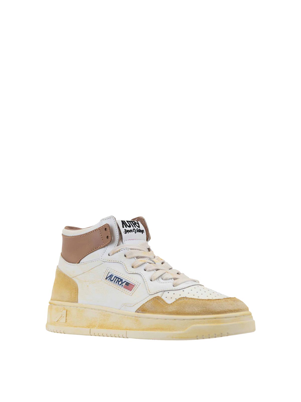 Women's sneakers by Autry. upper made of leather, with tampered leather inserts. Tonda, pierced tip. Interior made of fabric, for a greater feeling of comfort during use, with higher edges and rear part with height height in leather. Tab made of fabric, padded on the sponge, characterized by logged patch. Logo/Written brand on the side and on the sole. External surfaces characterized by used/vintage style details. Rubber sole with excellent resistance allusure.