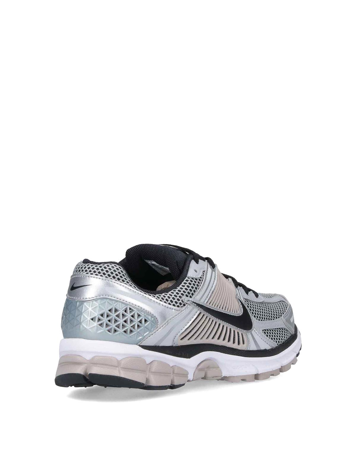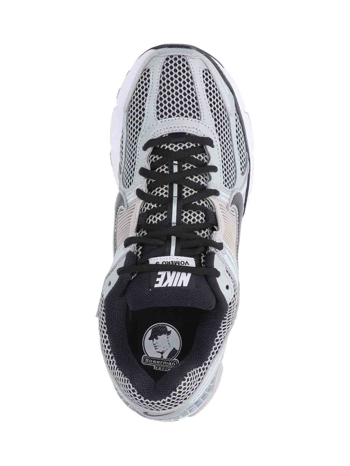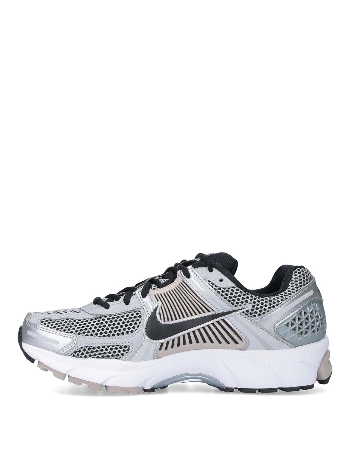 Nike zoom vomero 5 sneakers, in silver mesh, round toe, lace closure, logo tag on tongue, contrasting swoosh logo on the side, textured rubber sole.