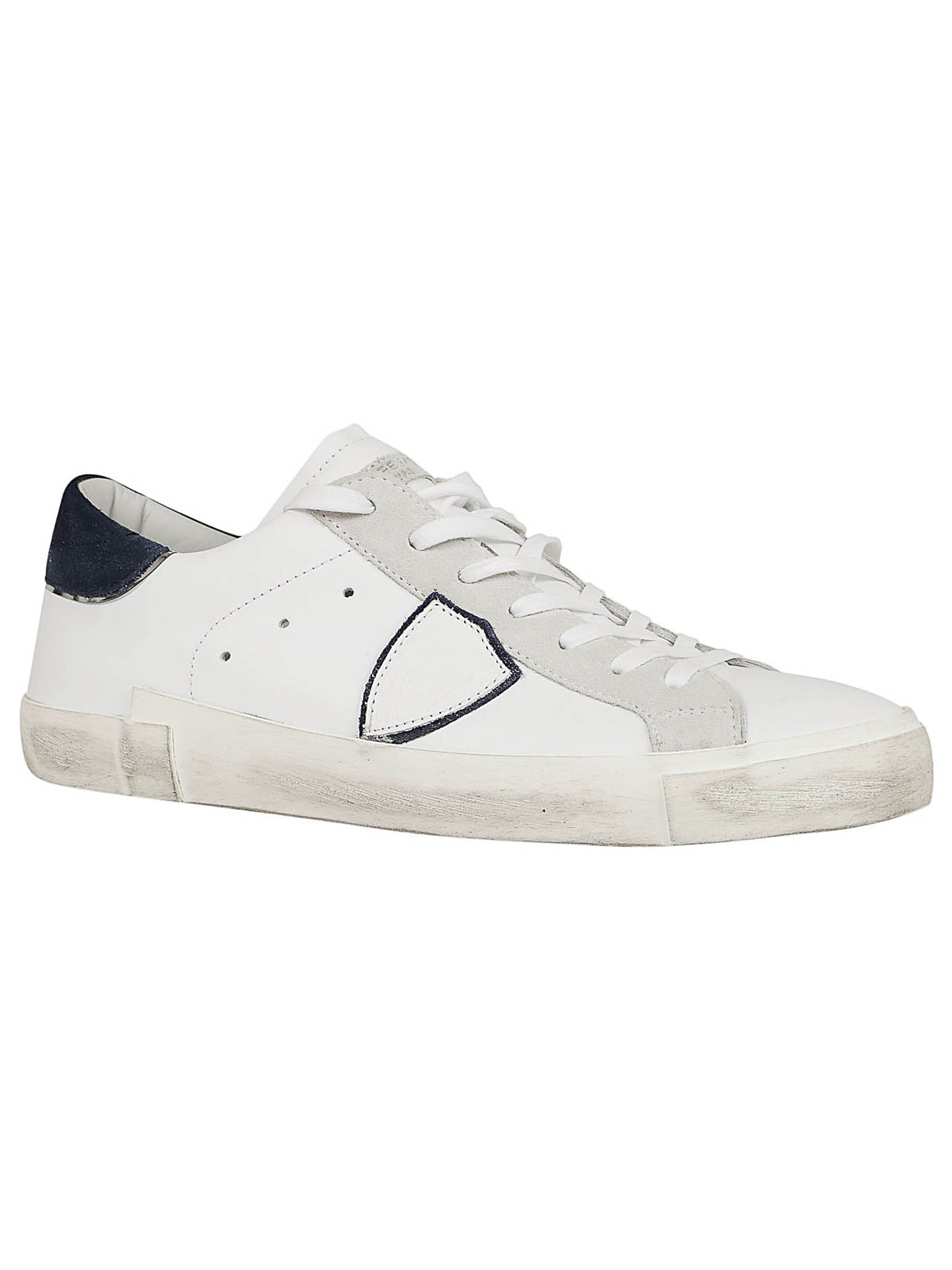 White/navy blue leather design with a round toe, two-tone panels, a logo patch on the side, a logo patch on the tongue, a logo print on the back, a lace-up front, and a flat rubber sole.