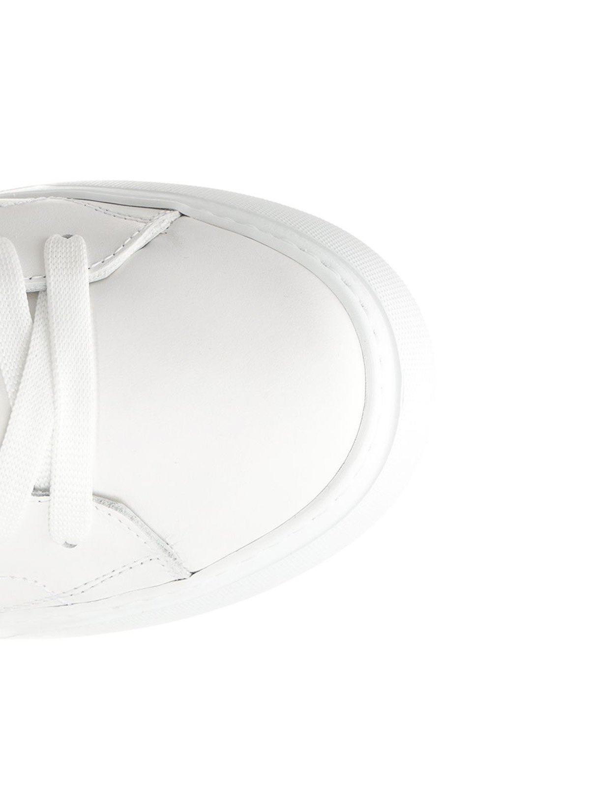 Philippe model temple leather sneakers, high sole, upper in soft white calfskin, green vinyl spoiler that matches the underside of the heel and ultralight rubber sole.