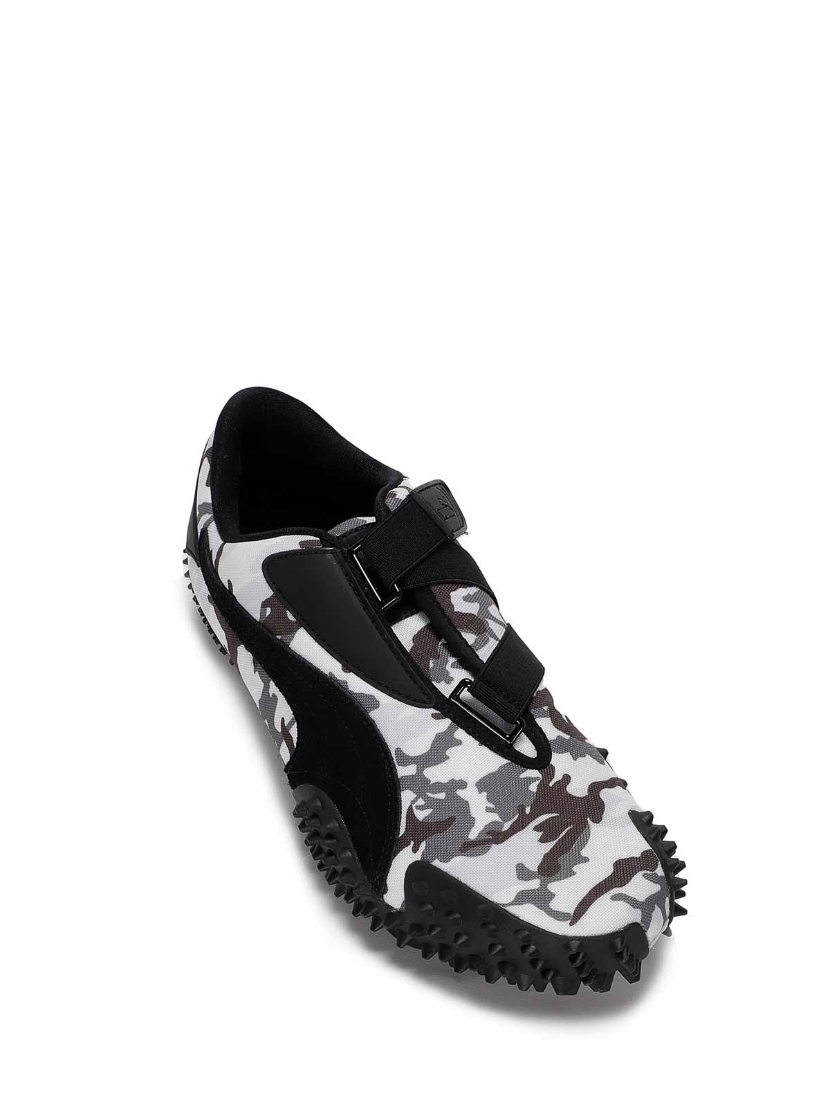 Black and white puma monster camo sneakers, rubber sole with spikes and upper closure with strap, low ankle.