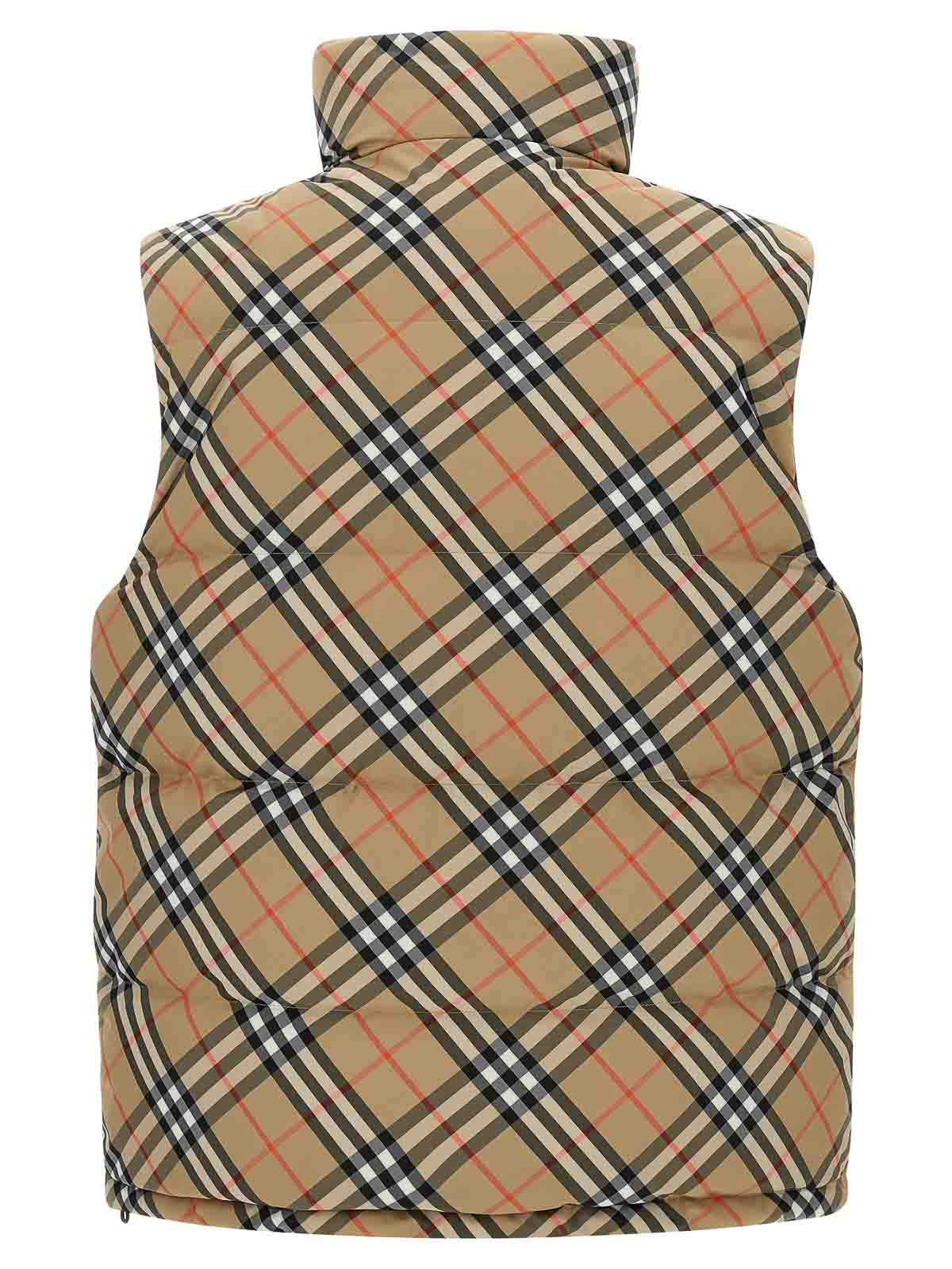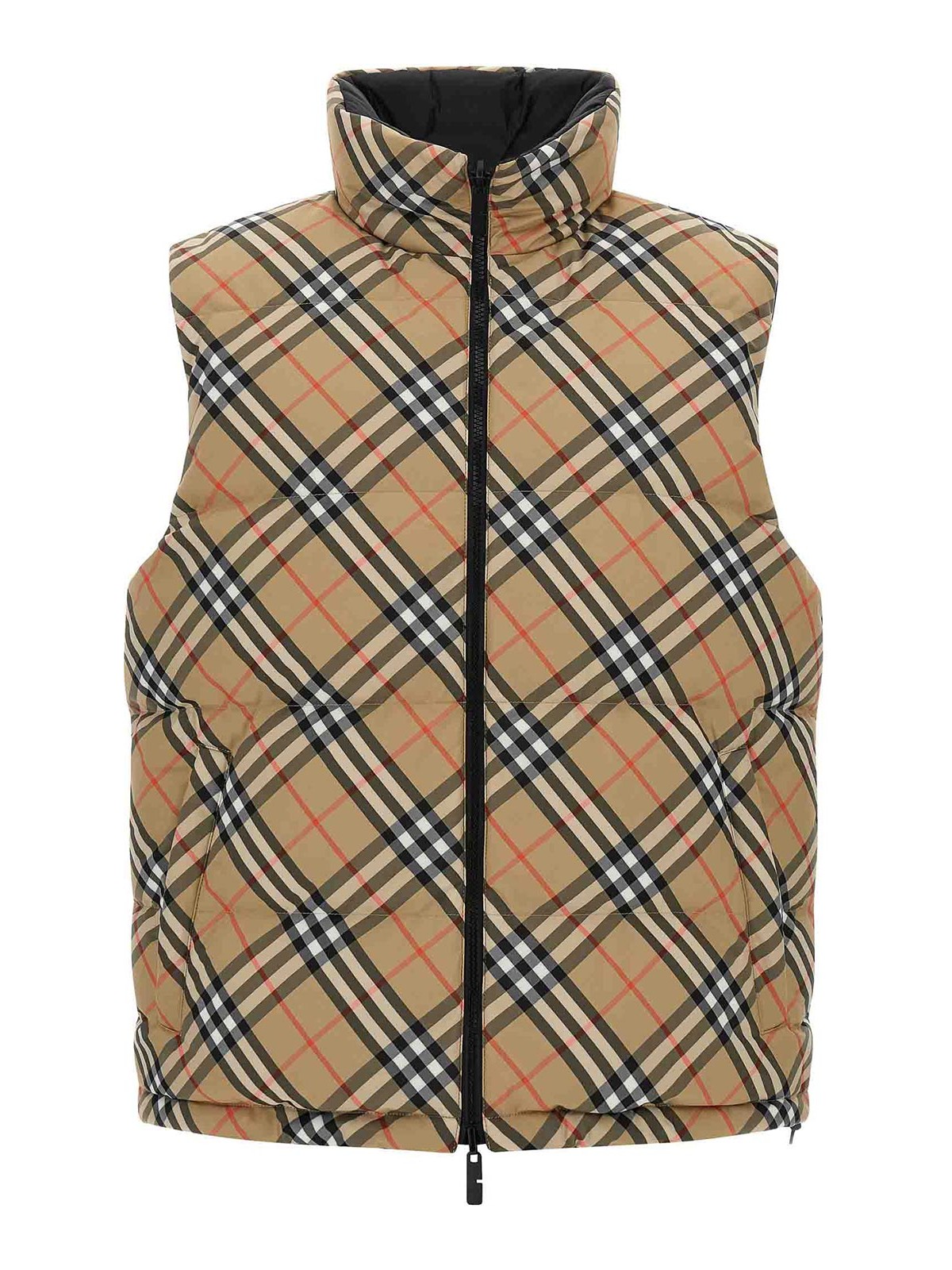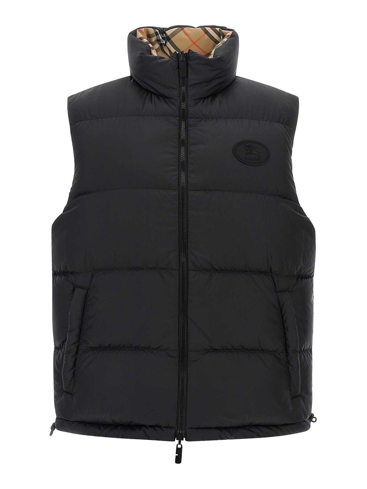 snowshill' reversible vest in burberry check fabric and solid quilted nylon with goose down padding, silicone 'equestrian knight design' patch and front zip closure, standing collar, pockets, drawstring at the hem.