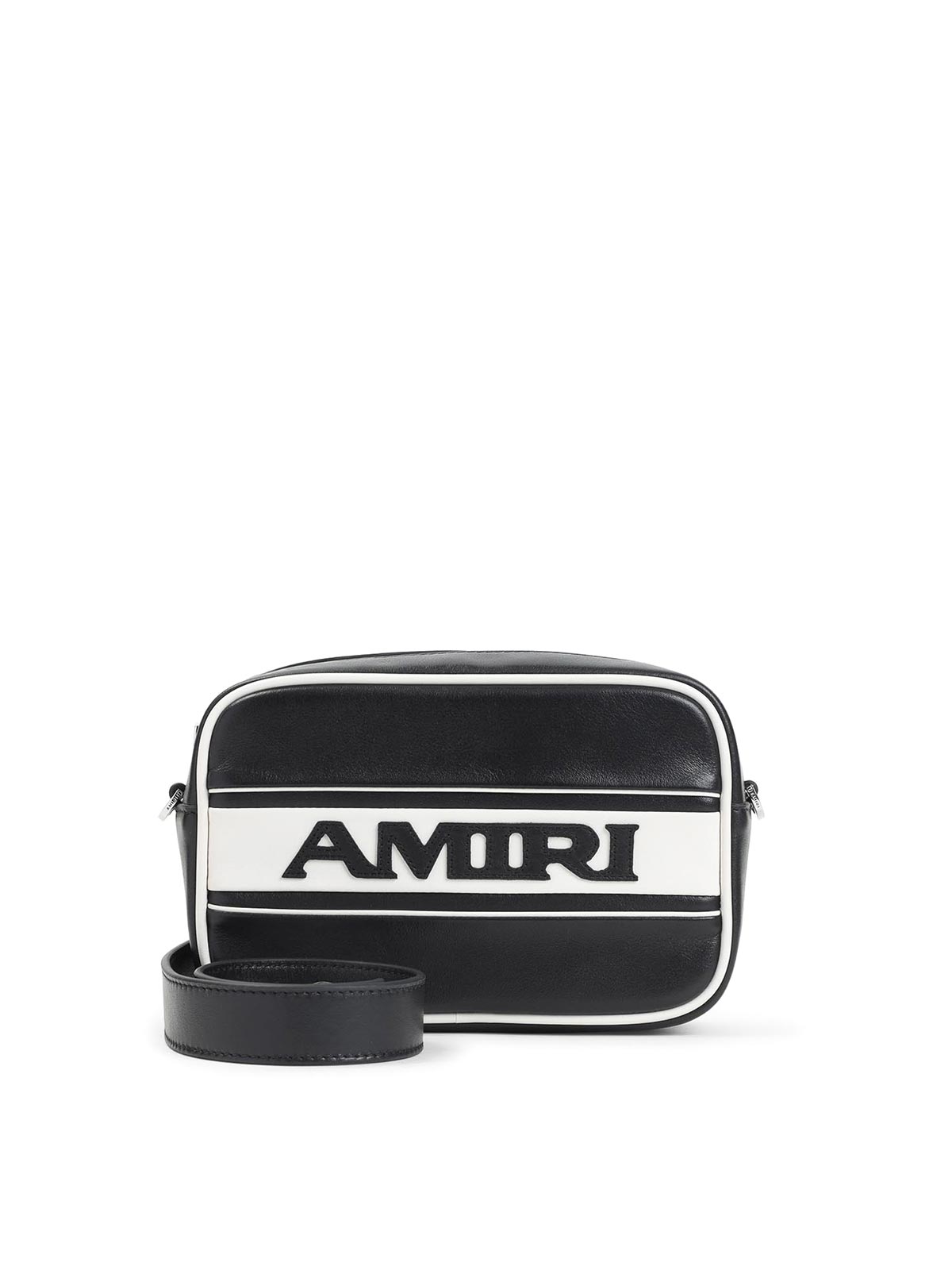 Amiri black cow leather sport camera case. pure black cow leather shoulder bag, top zipped fastening, front lettering logo, adjustable shoulder strap. white details on the front, on the back and on the edges.