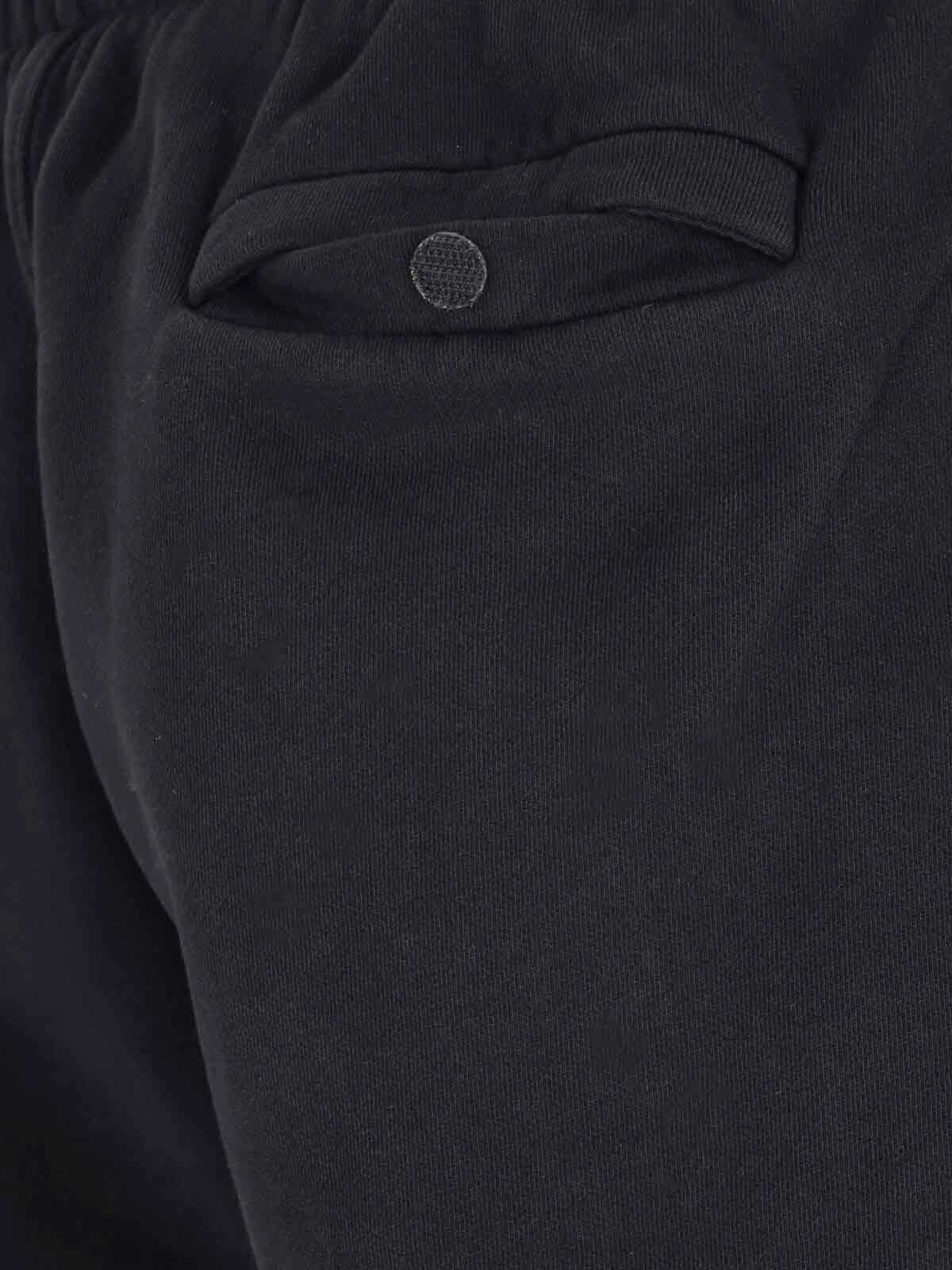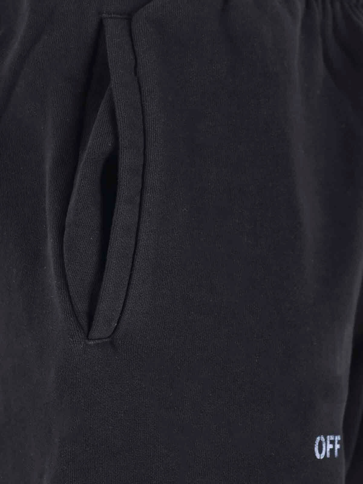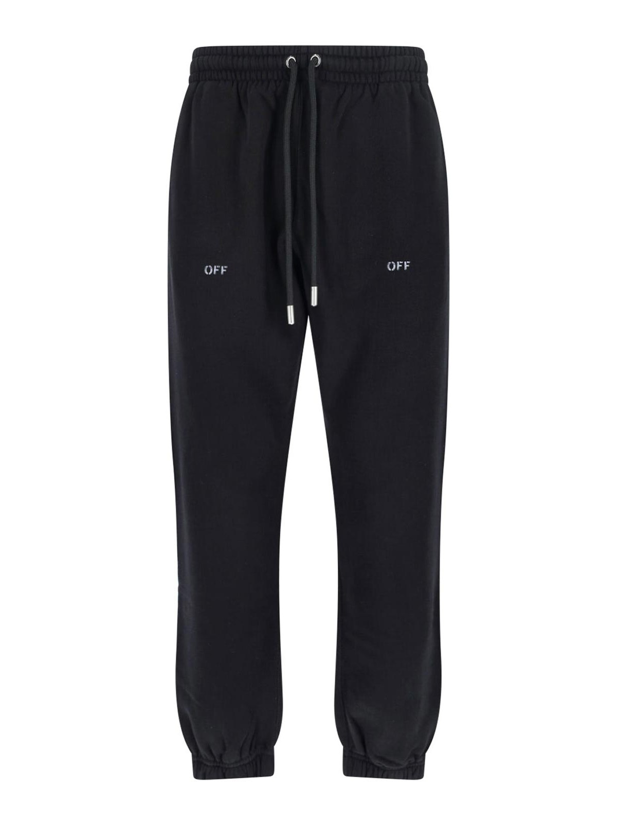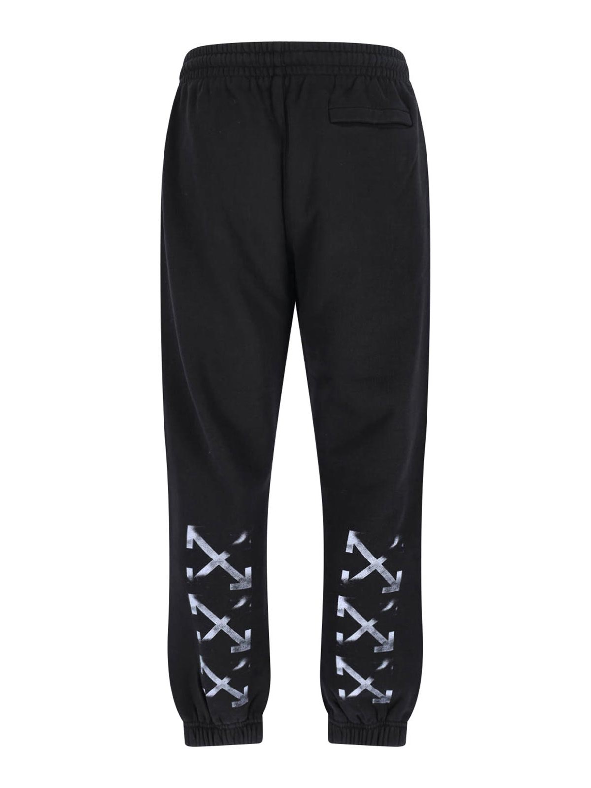 Off-white stencil arrow sports trousers, in black cotton, elasticated mid-waist, drawstring closure, two side pockets, contrasting logo print on the front, one back pocket, maxi logo print on the back, elasticated hems, straight leg.