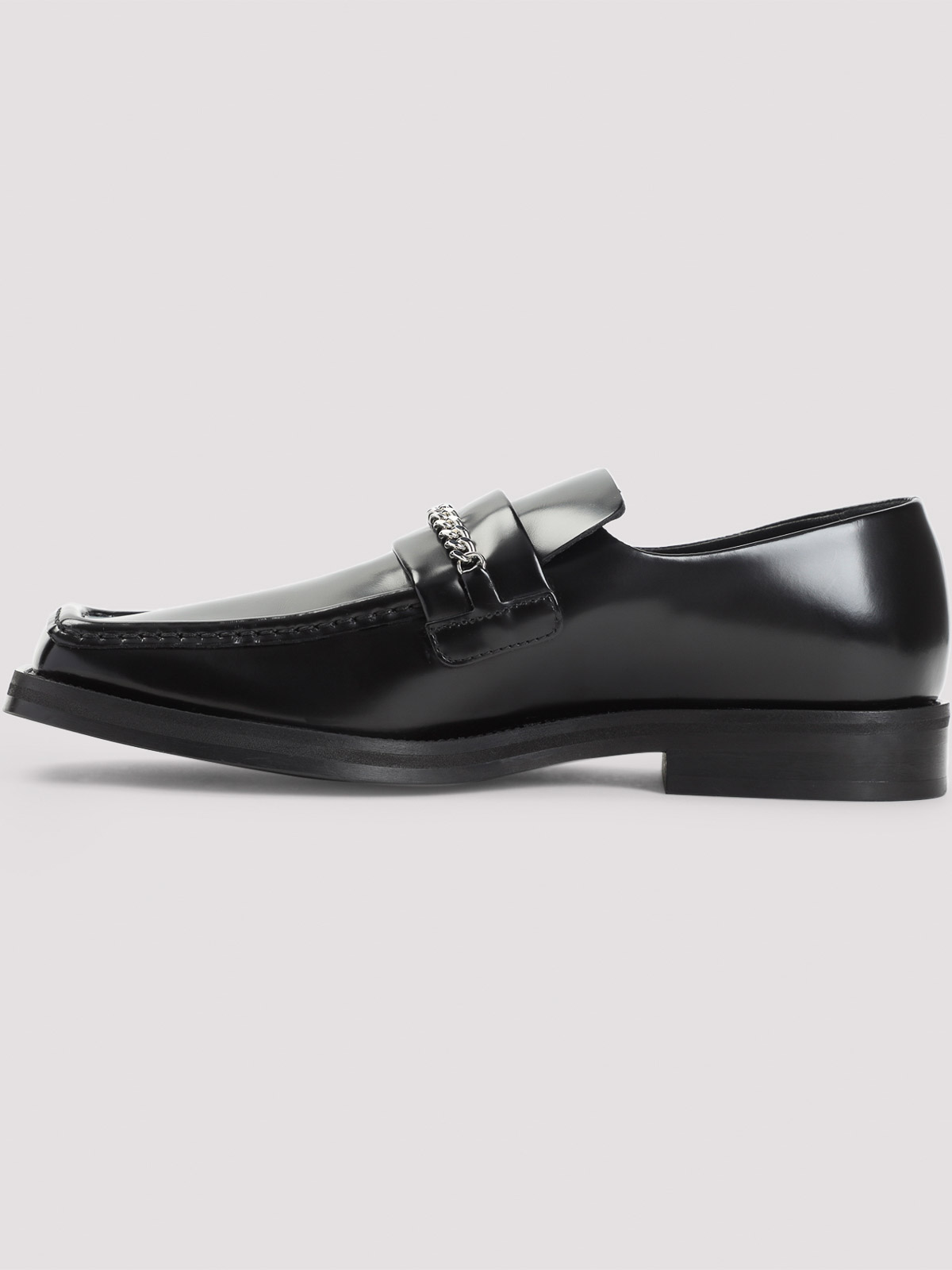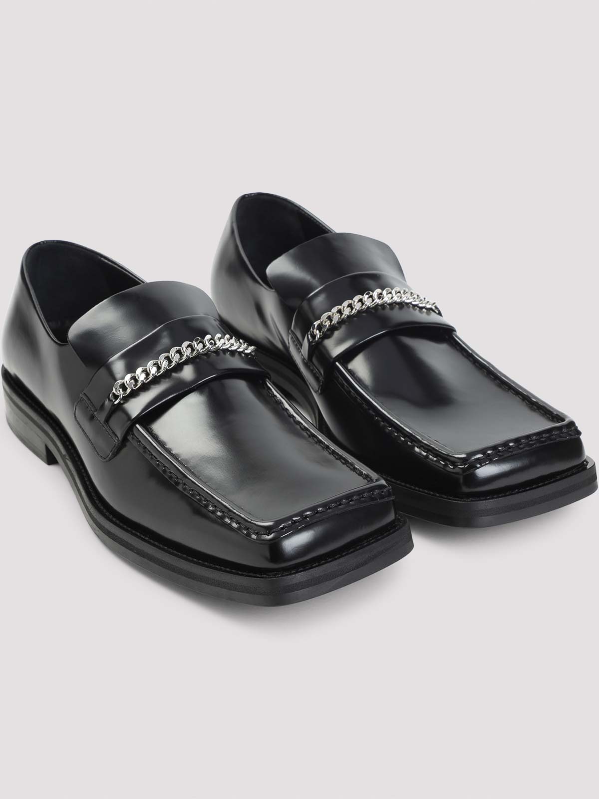 Martine rose square toe black loafers crafted from black brushed square toe penny strap with, toned chain in and out