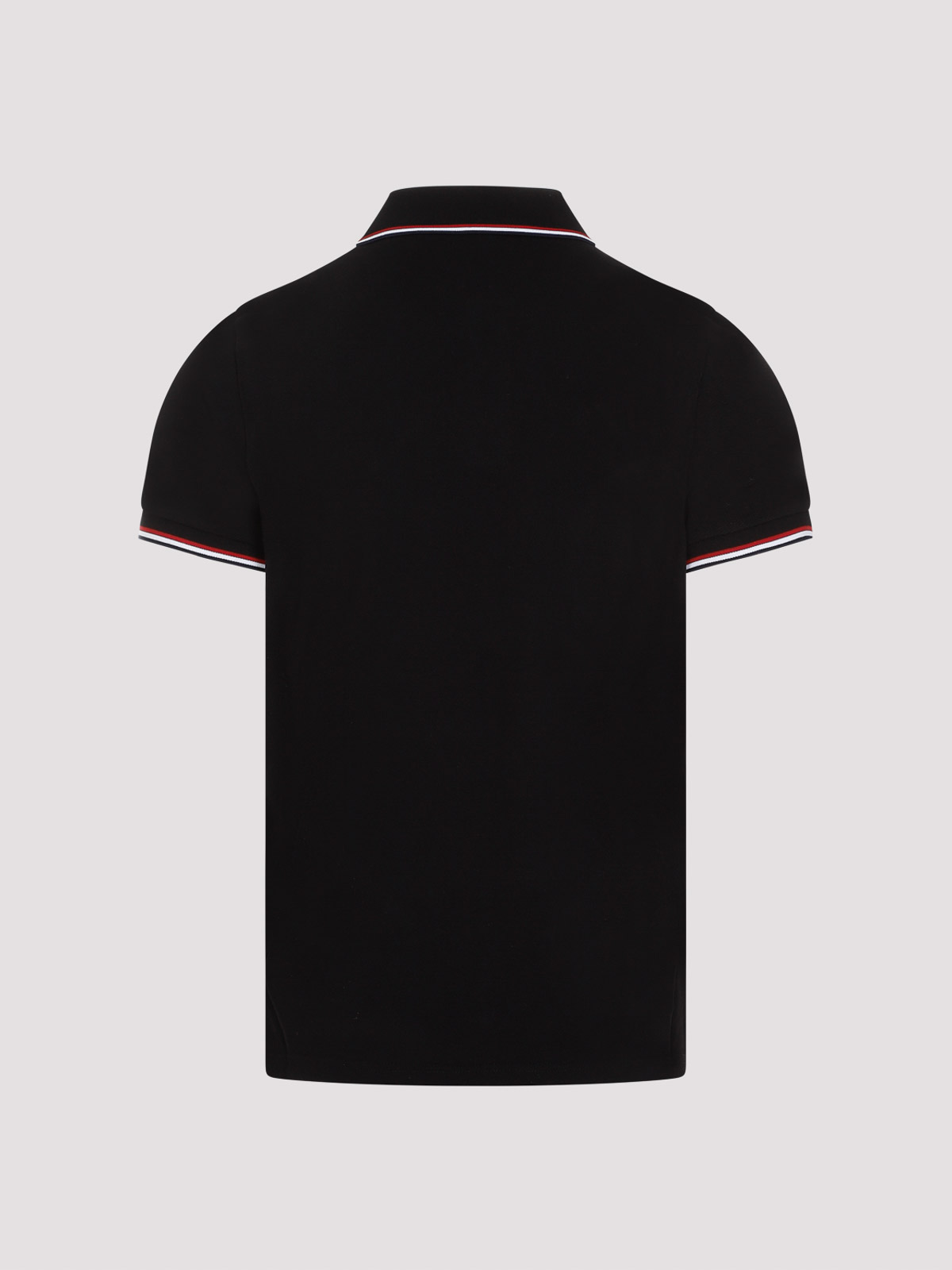 Moncler black cotton ss polo t-shirt. pure black cotton t-shirt, classic polo collar, chest patch logo, short sleeves, straight hem. white and red stripe details on the collar and on the edges.