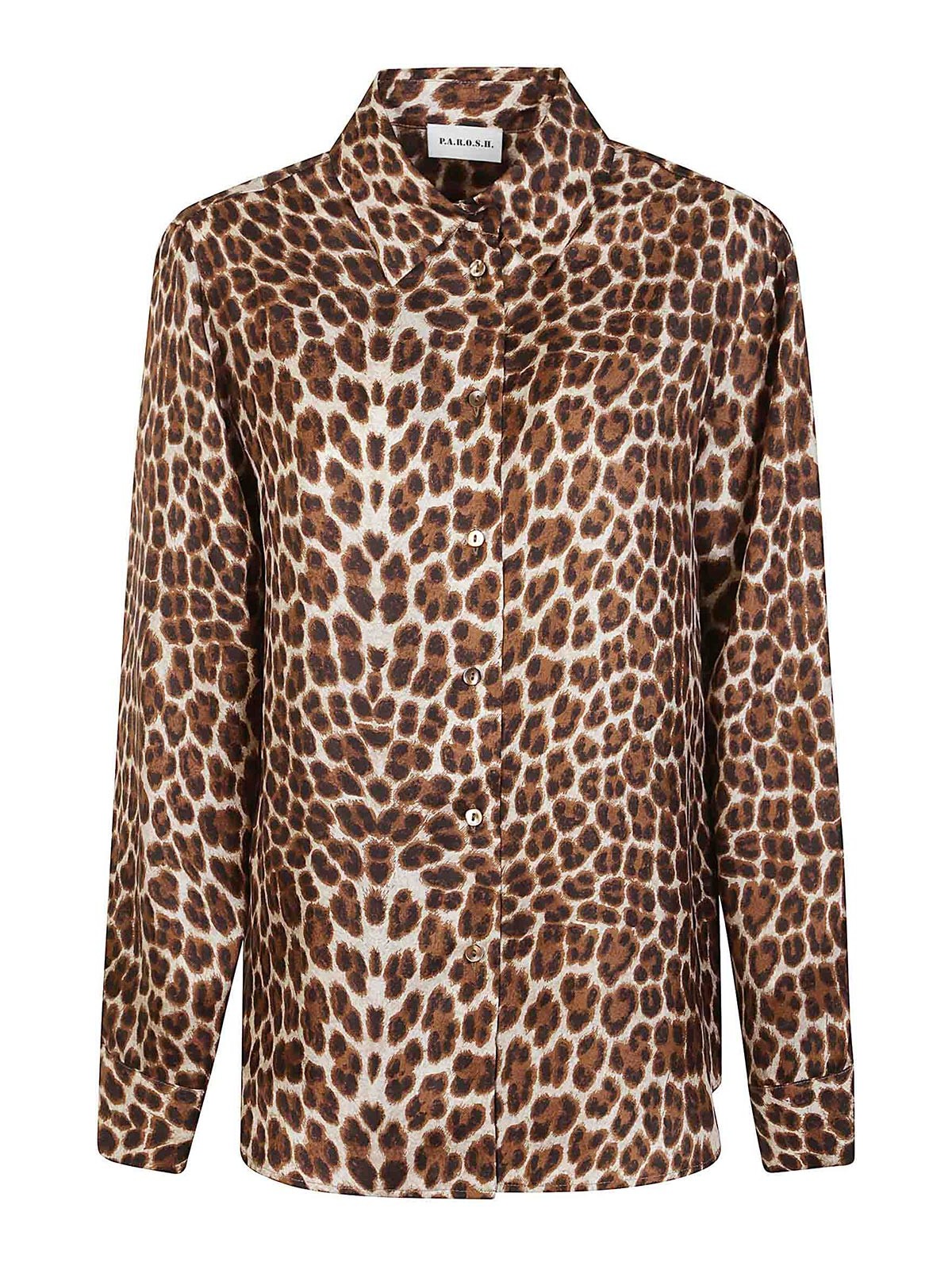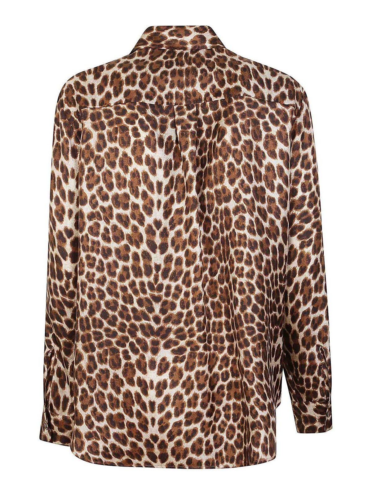 Silk twill shirt, leopard print, pointed collar, mother-of-pearl button fastening, yoke on the back, overfit.