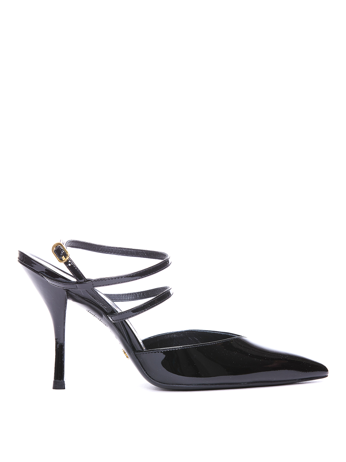 Stuart weitzman black strapeze pump adjustable buckle closure ankle closure point toe patent leather upper and leather