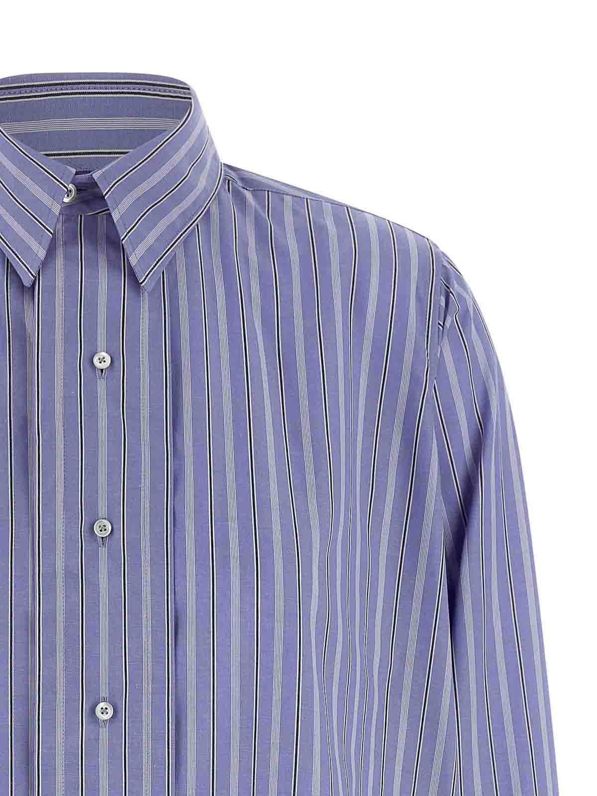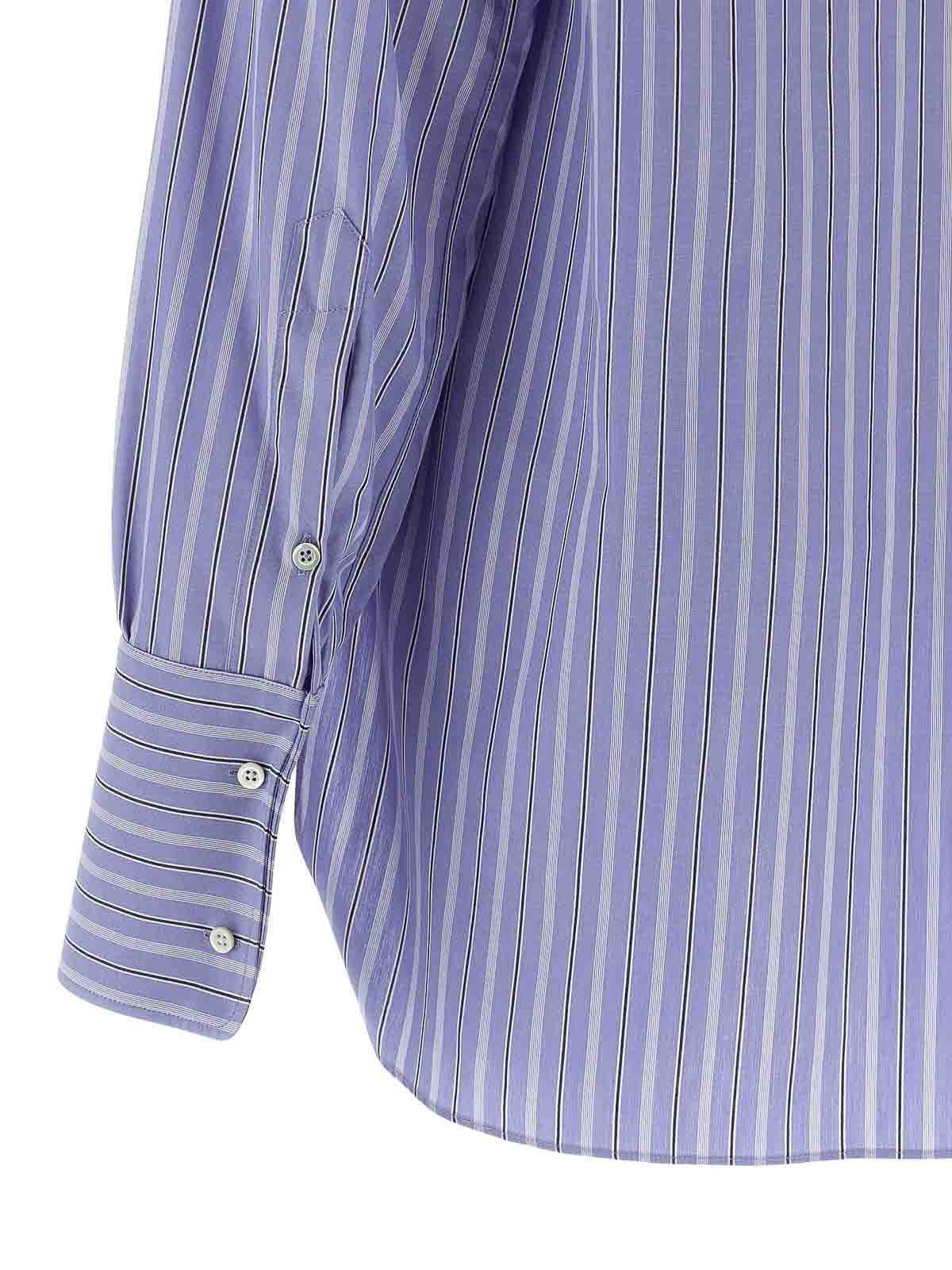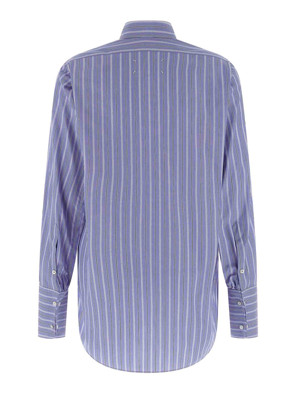 Striped cotton shirt with front button closure, long sleeves with oversized cuffs, asymmetrical hem with curved front and back 'four stitches'.