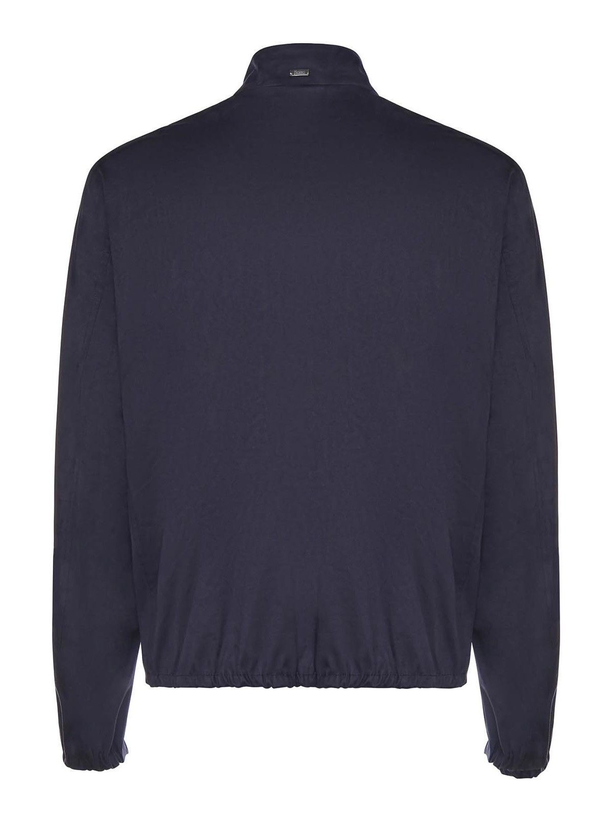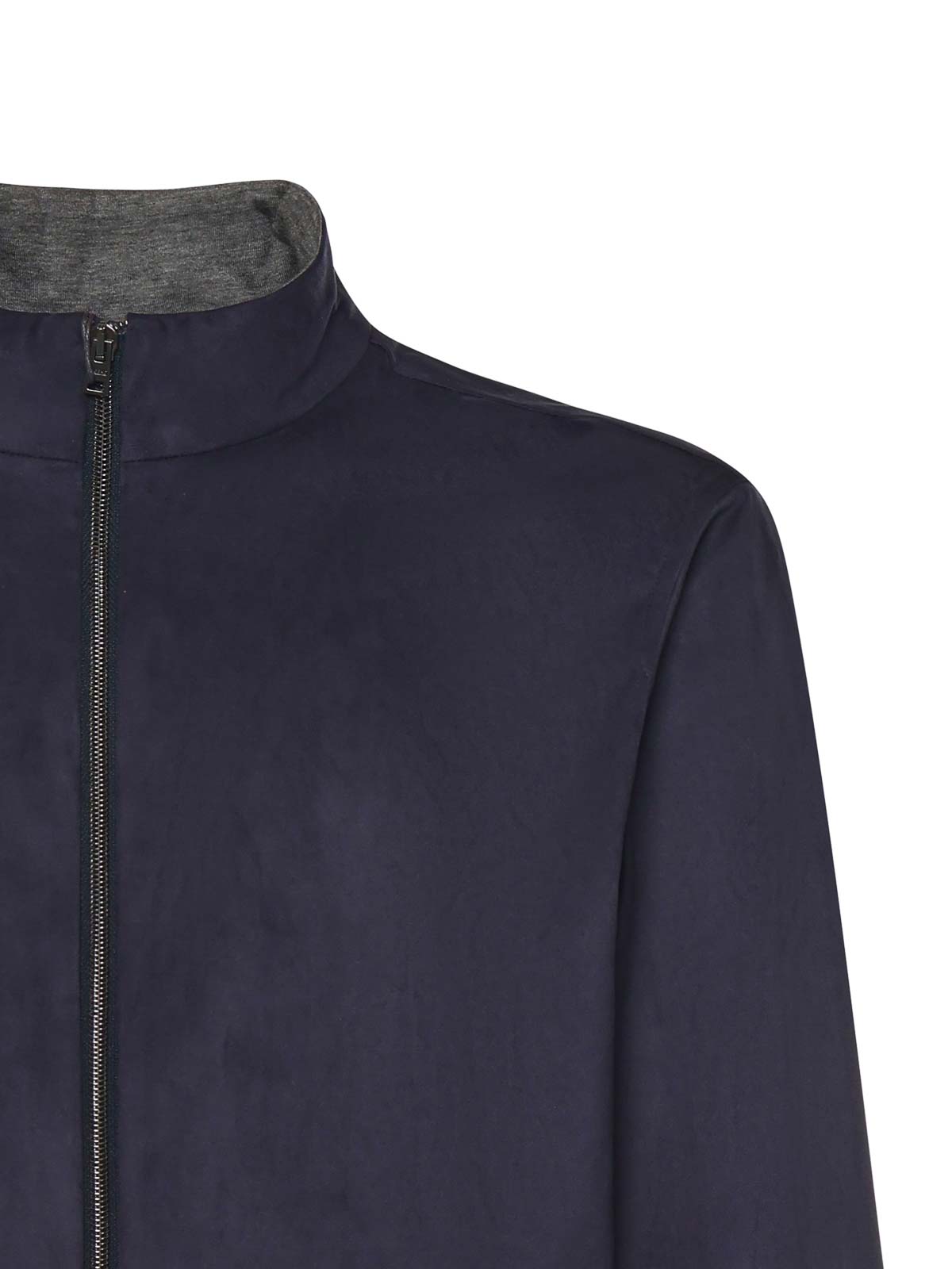 made of soft suede microfiber, front zip closure, long sleeves, patch pockets with button, size shown is 50, made in italy, designer color: resort blue