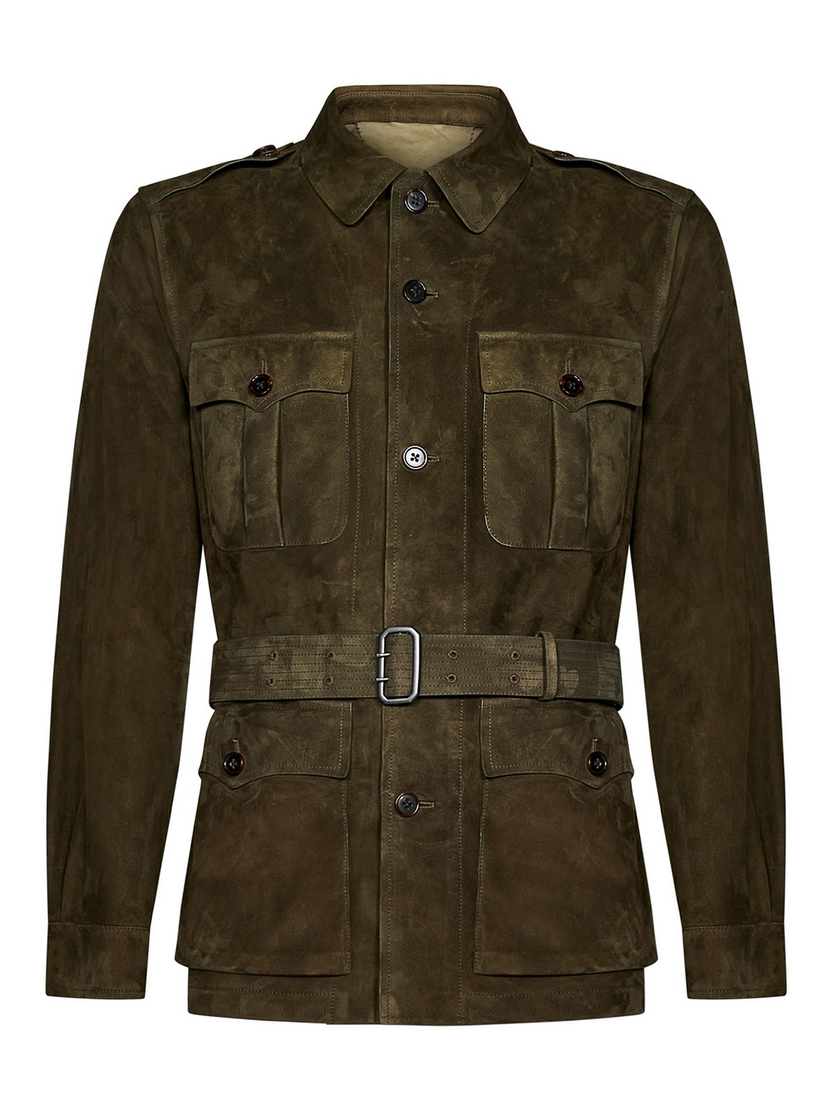 Front closure with buttons point collar button cuffs removable and adjustable belt with buckle at the waist four patch pockets on the front with flap and button shoulder tabs green 100% lamb leather the item in the photo corresponds to a it size