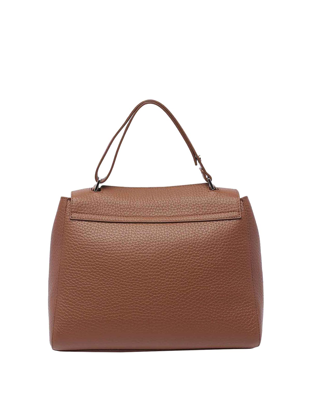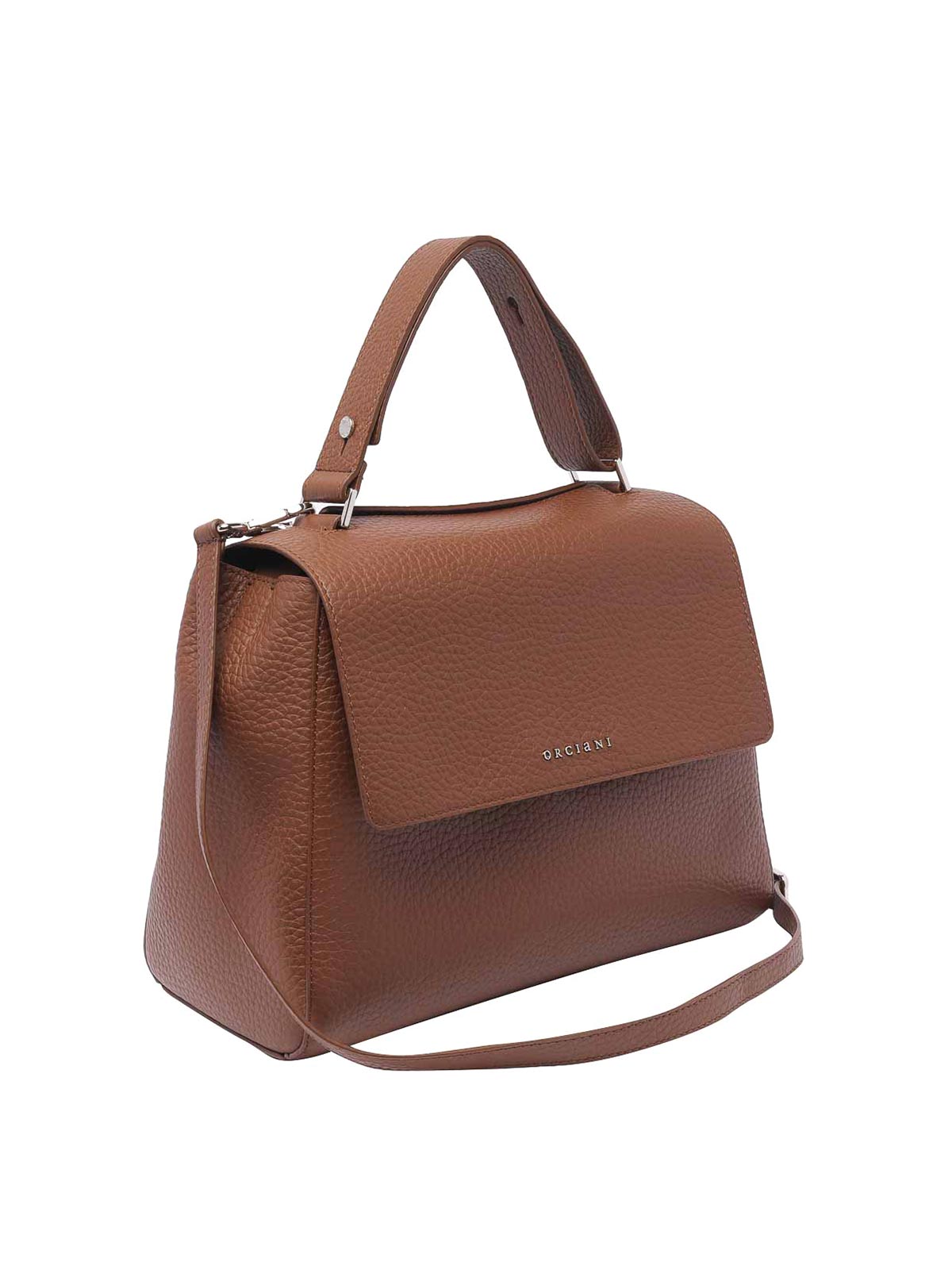 Orciani carrubba brown sveva handbag logo on front magnetic closure inner zip pocket and two open adjustable handle adjustable and removable strap