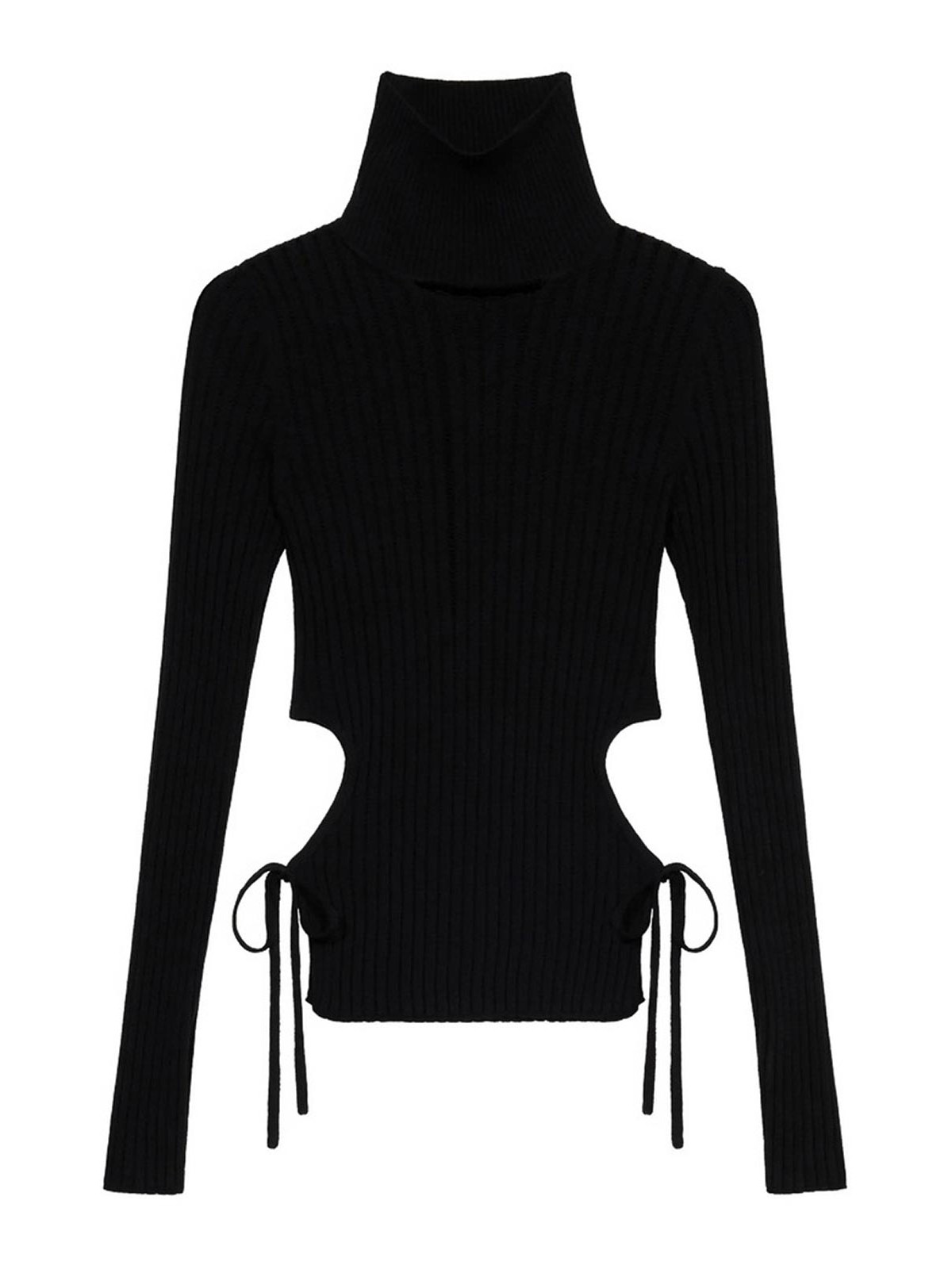 Black ribbed knit turtleneck side cut-outs tie fastenings long sleeves