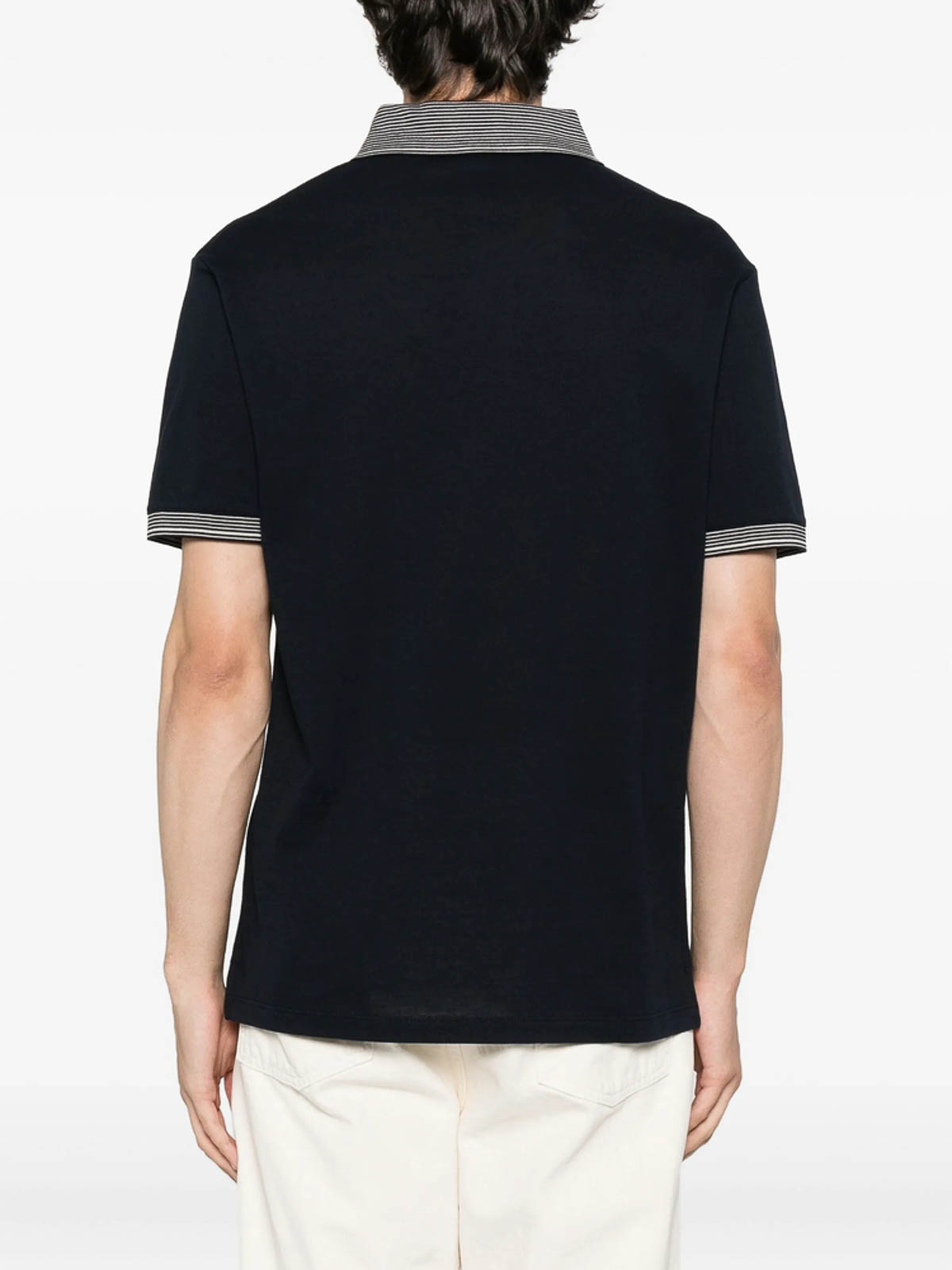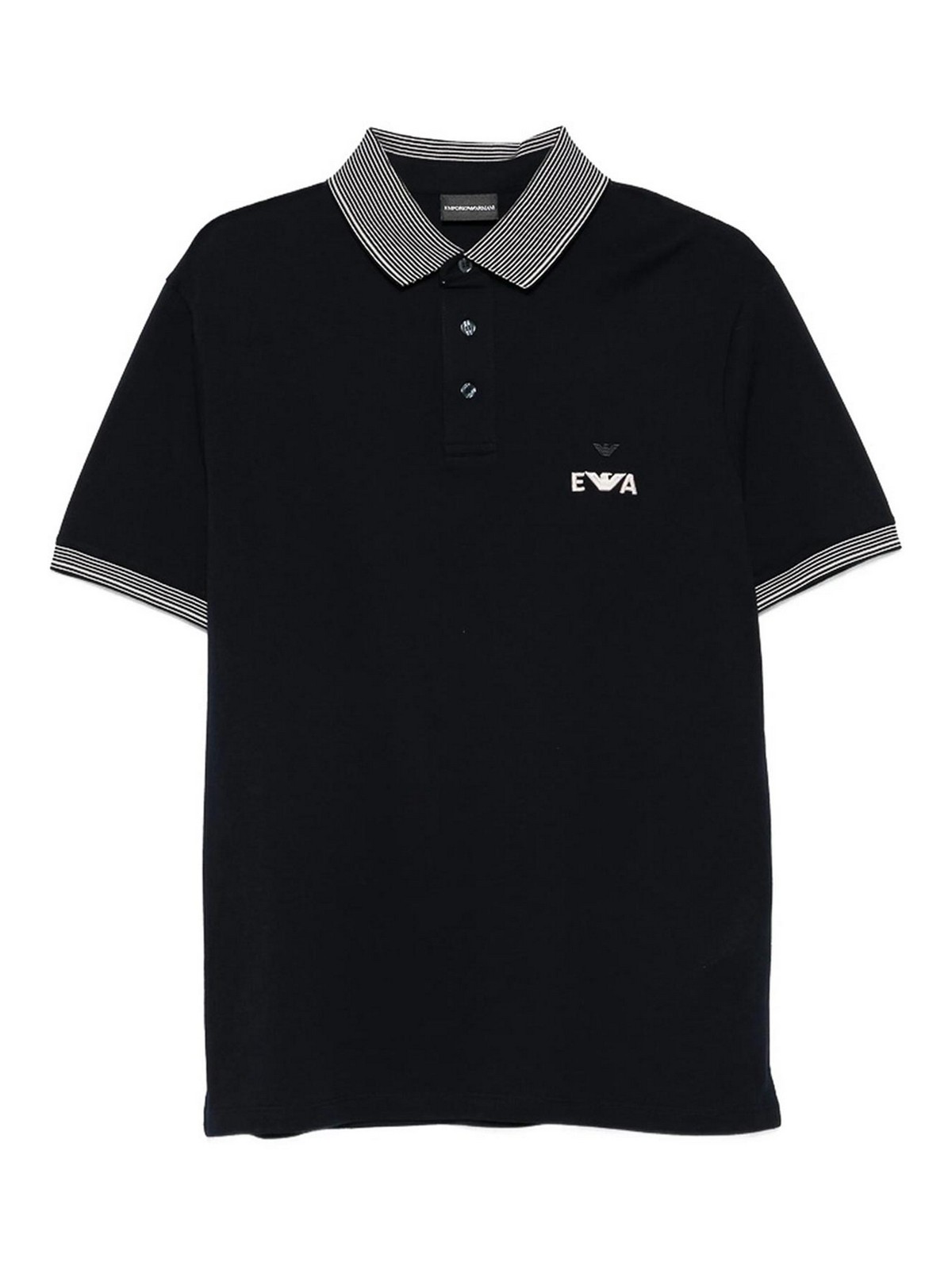 Navy blue striped collar logo embroidery short sleeves button fastening cotton