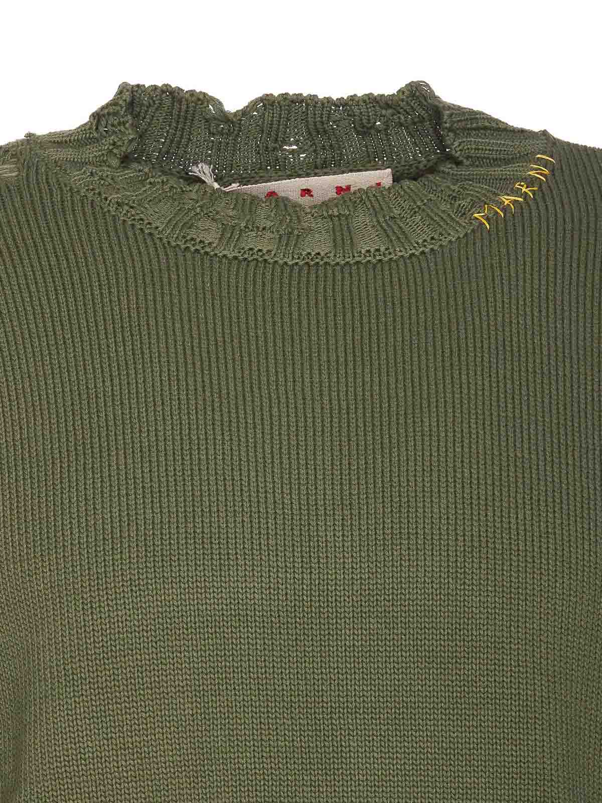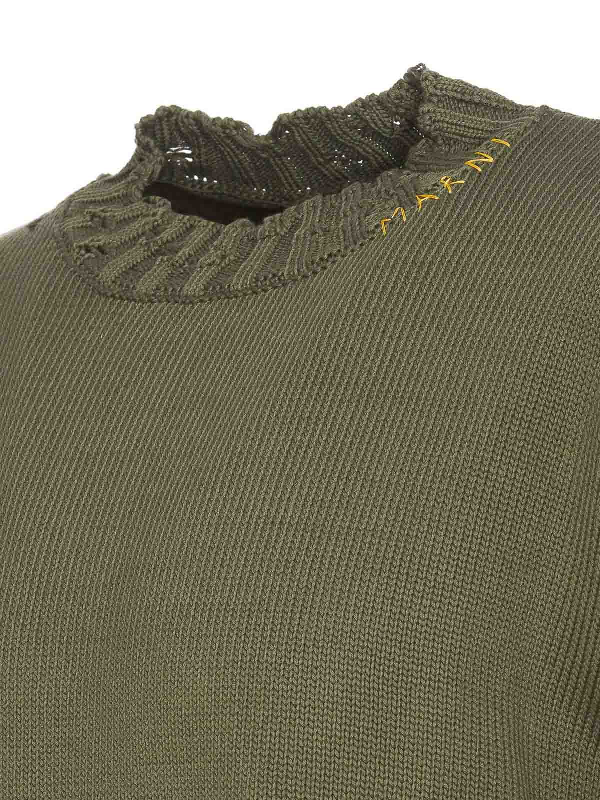 green sweater crewneck long sleeves distressed effect embroidered logo on collar