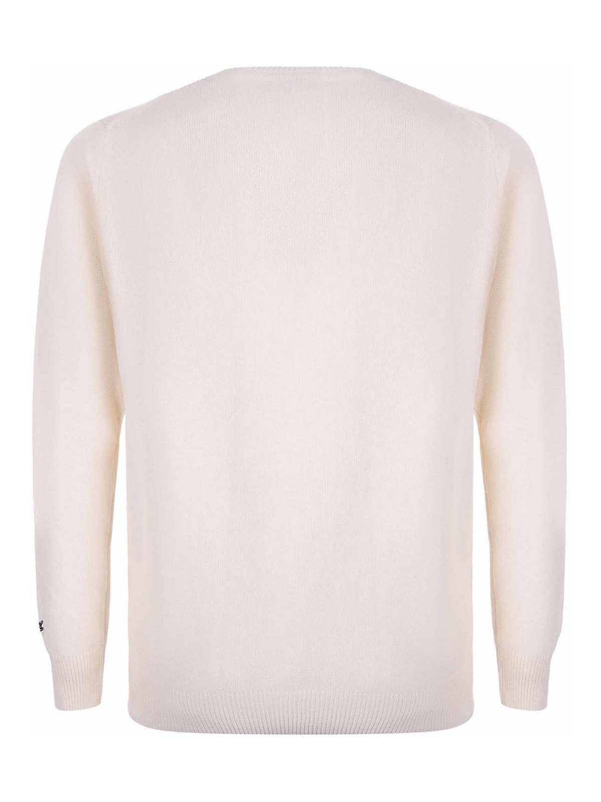 Mc2 saint barth wool and cashmere blend sweater in cream. ribbed crewneck. bubbles please embroidery on the front. long sleeves. ribbed cuffs and hem. size shown: m 45% wool, 30% viscose, 15% polyamide, 10% cashmere