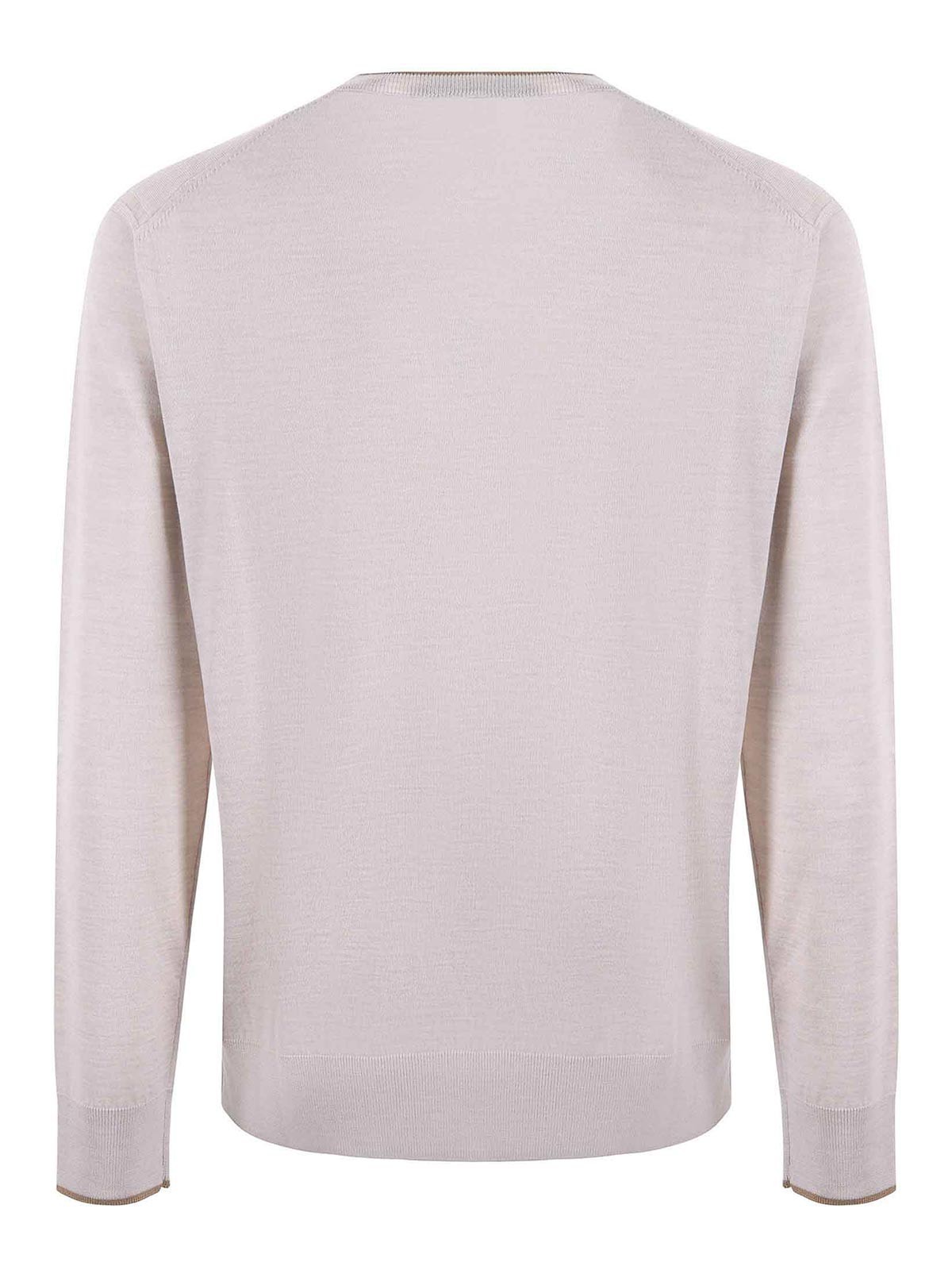 Paolo pecora sweater in beige virgin wool. 16 gauge. double-knit crew neck with contrasting trim. long sleeves. contrasting cuffs. size m shown in photo 100% virgin wool