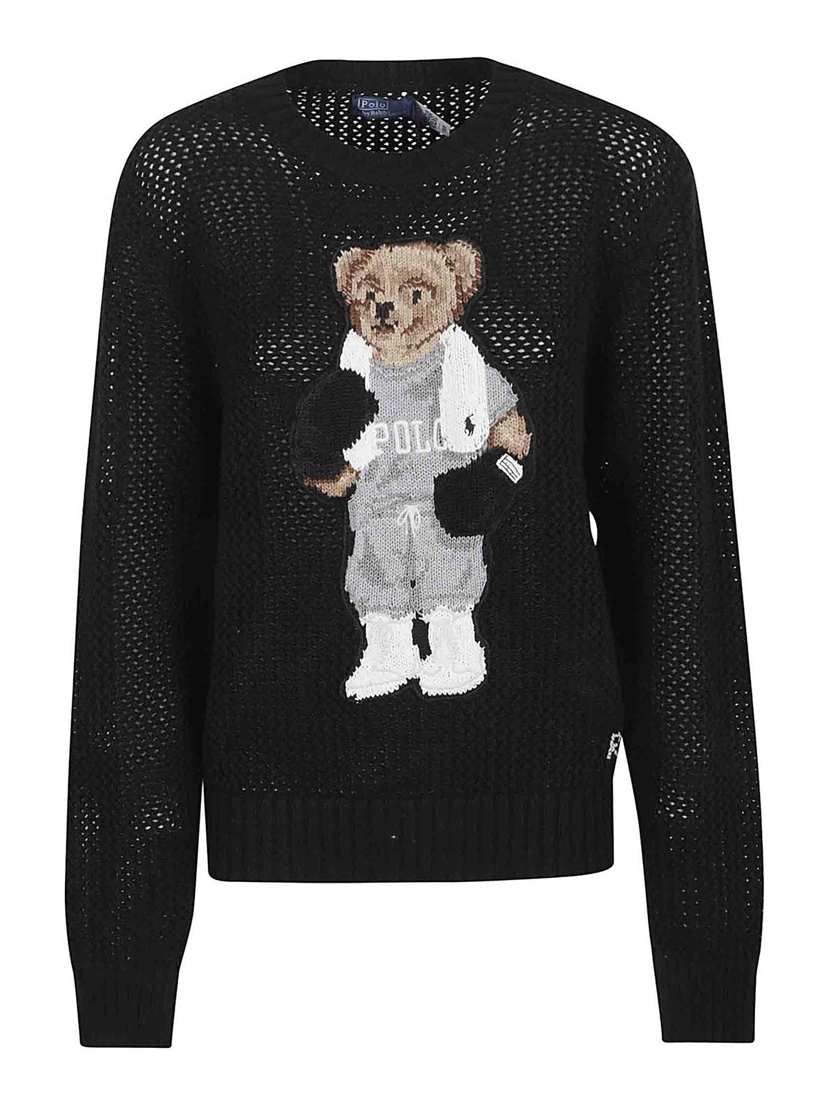 Pure cotton sweater with a textured pointelle knit by Polo Ralph Lauren, featuring a ribbed crew neck, long sleeves with ribbed cuffs, a relaxed fit, and a hip-length design. Featuring a boxer-style Ralph Lauren Polo Bear embroidered intarsia on the front and a cross-stitched RL monogram on the left hem.
