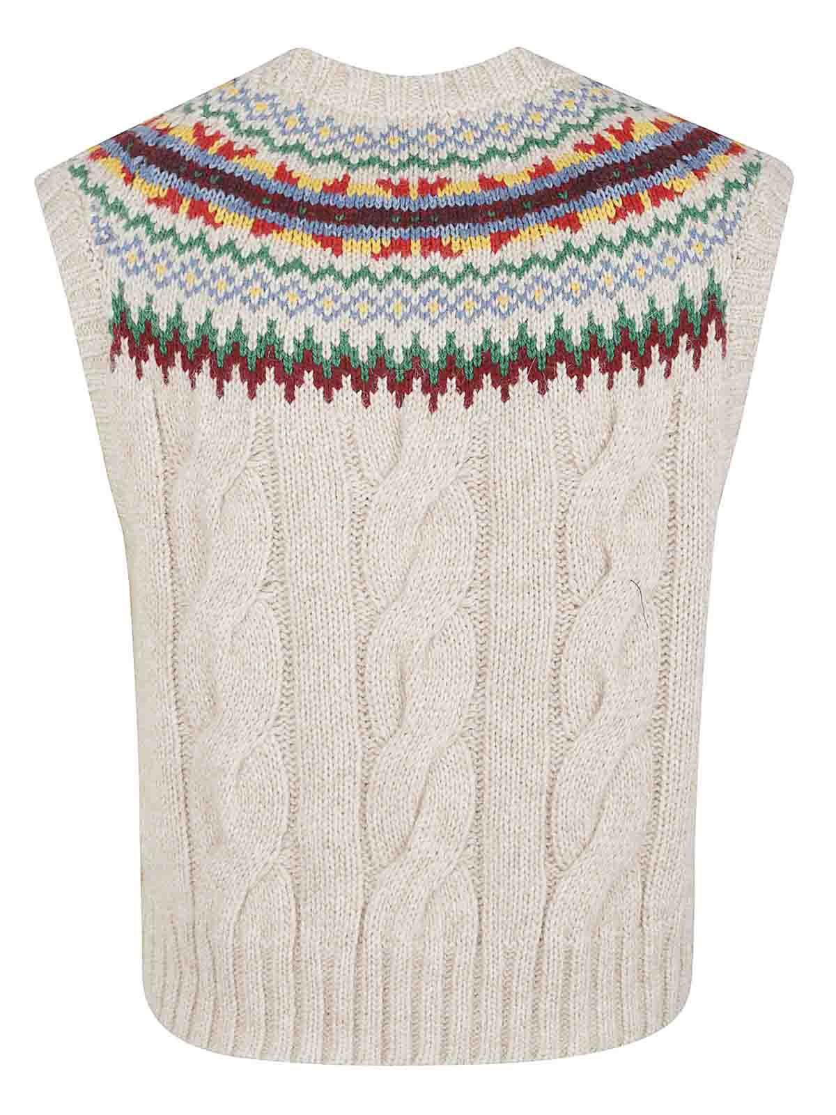 Polo Ralph Lauren heavyweight cotton and wool blend sleeveless vest, ribbed crew neck, slim fit. Featuring a wide cable knit with a rounded yoke and a colorful Fair Isle motif.