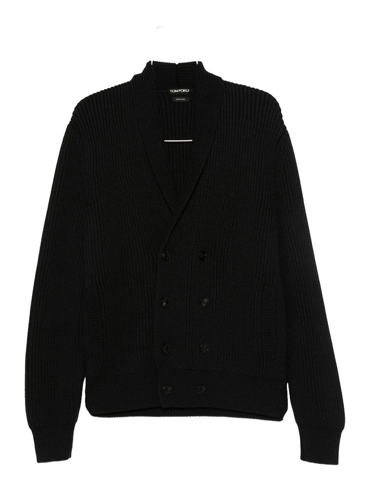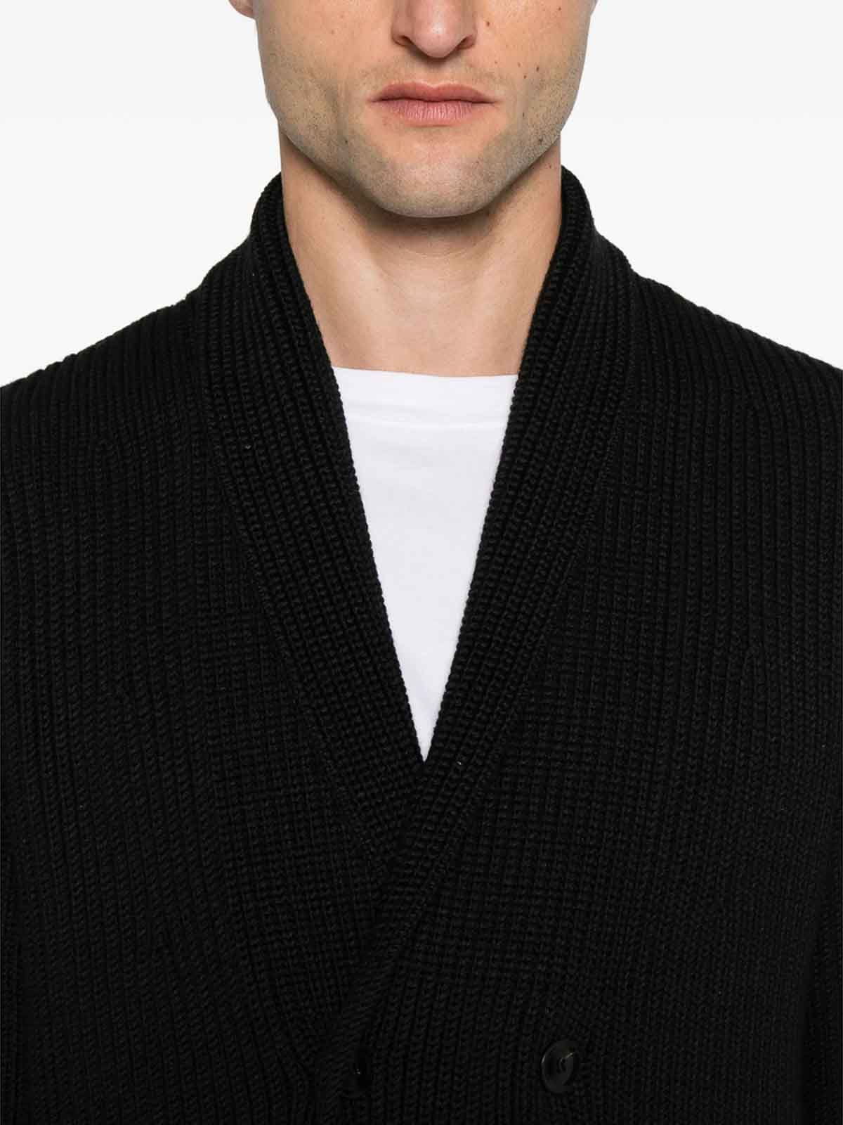Black ribbed knit shawl collar double-breasted button long sleeves